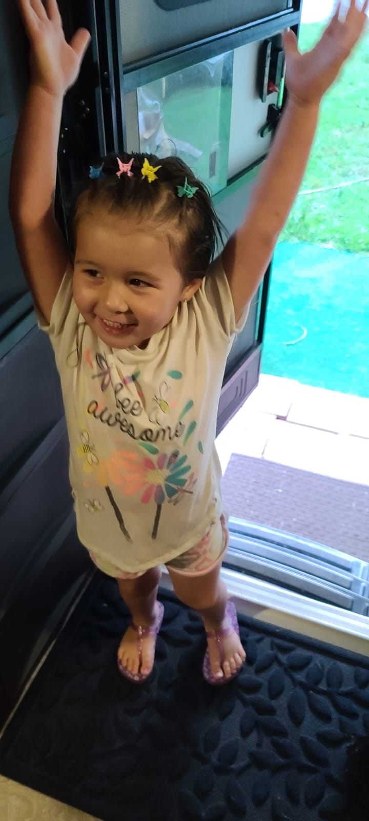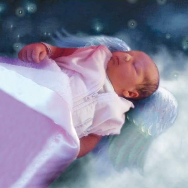 Painting of a sleeping newborn baby in a pink and white outfit, on a blue background with light orbs.