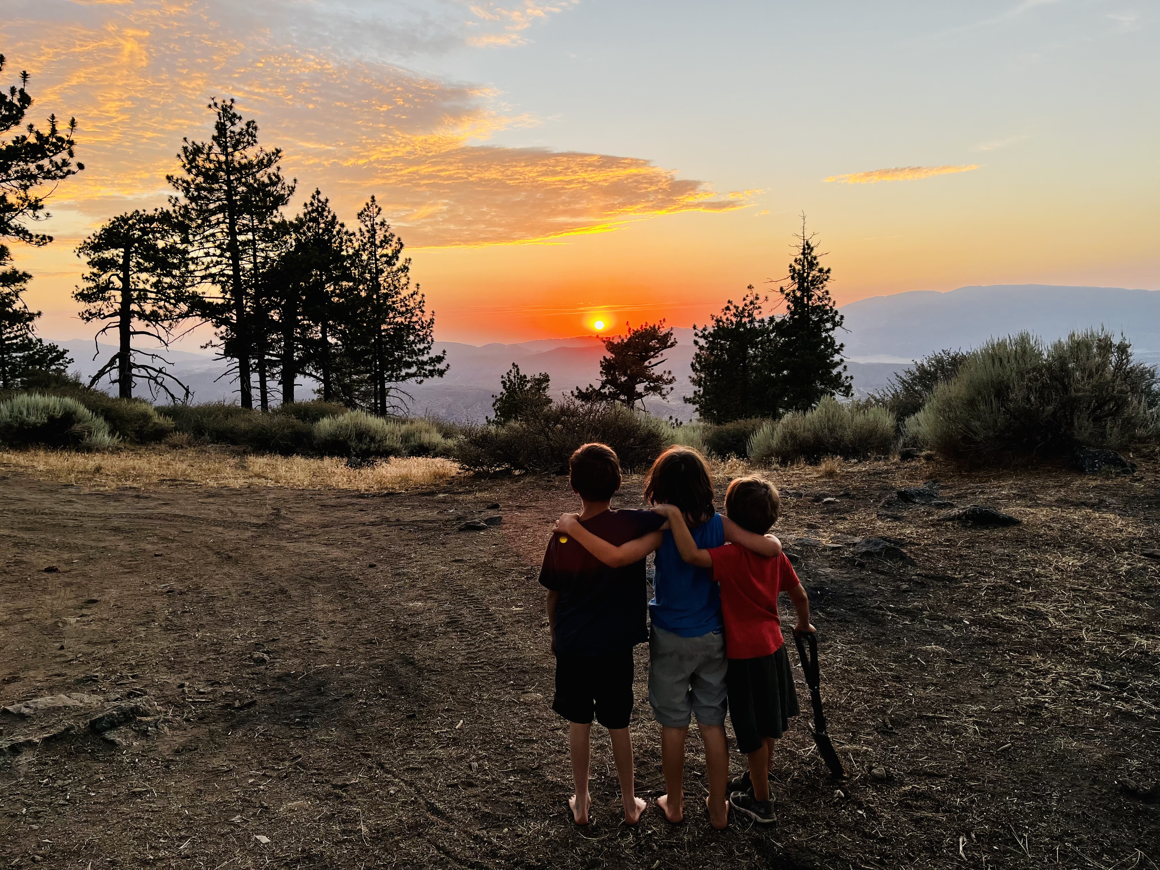 Painting of a couple wearing sun hats and sunglasses by a lake.