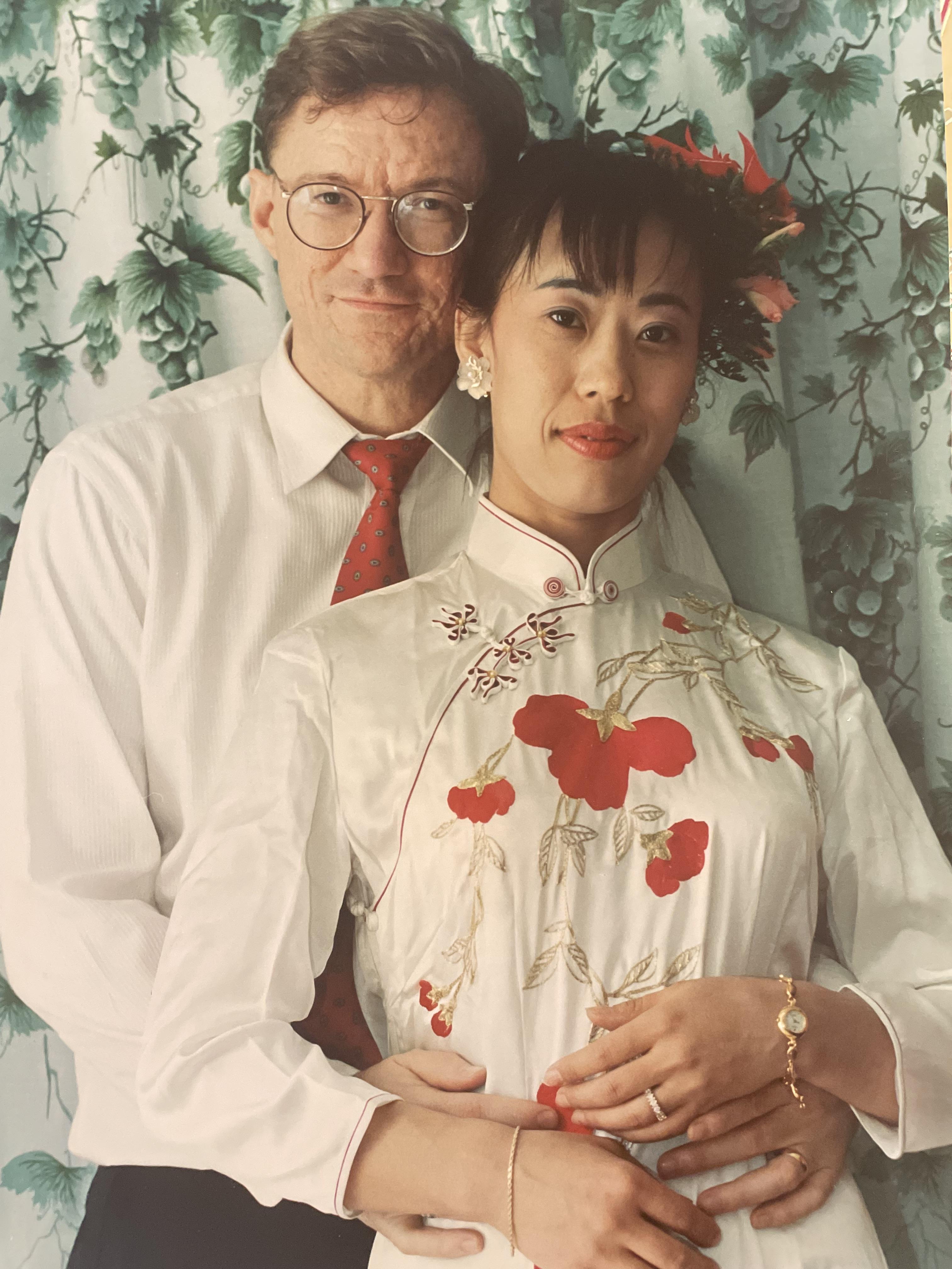 Portrait painting of a couple embracing, the woman wears a white embroidered blouse.