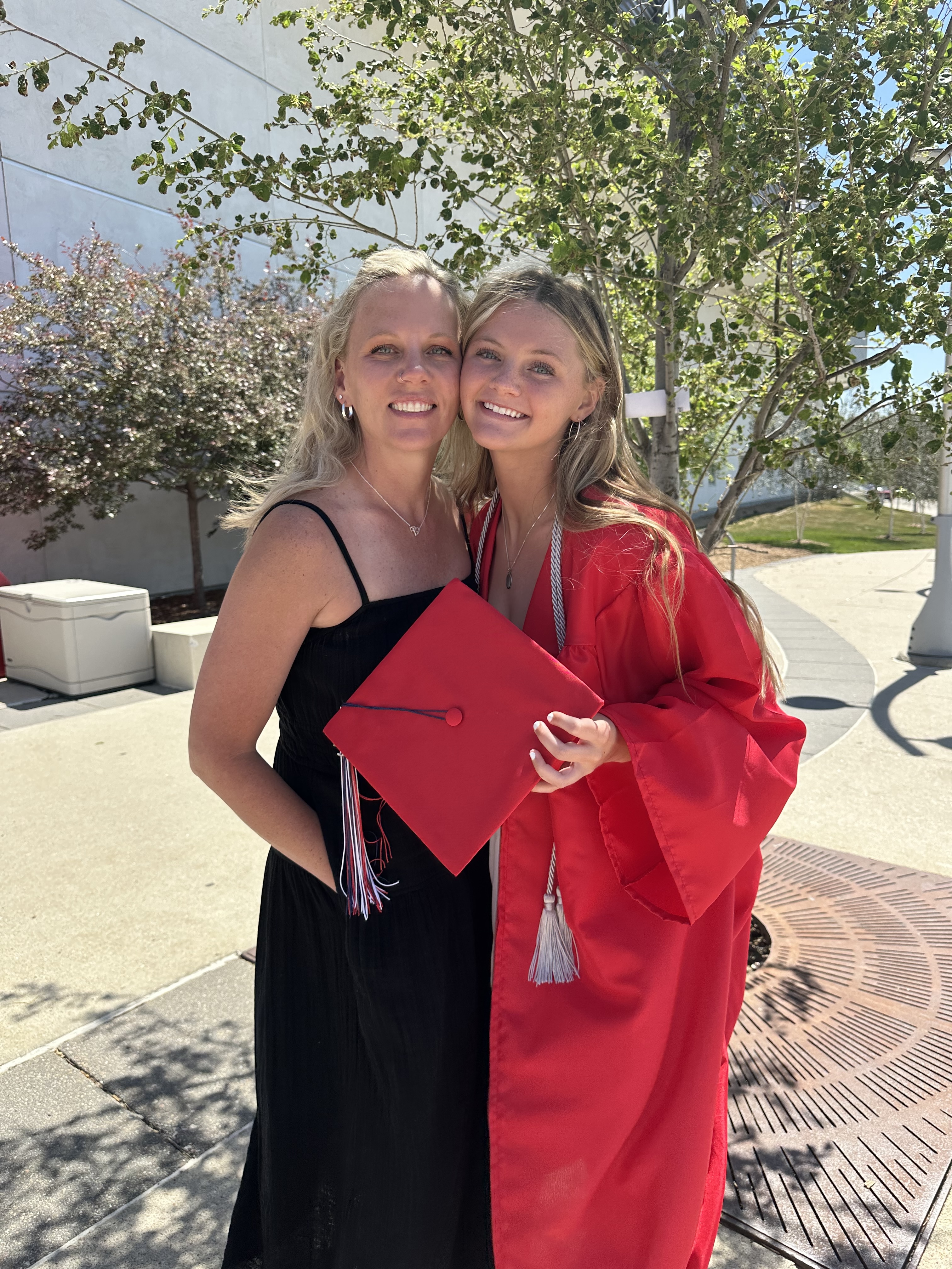 Painting of a man and woman, she`s in a red graduation gown, he has a goatee, and text overlay reads I was his angel and now he`s mine.