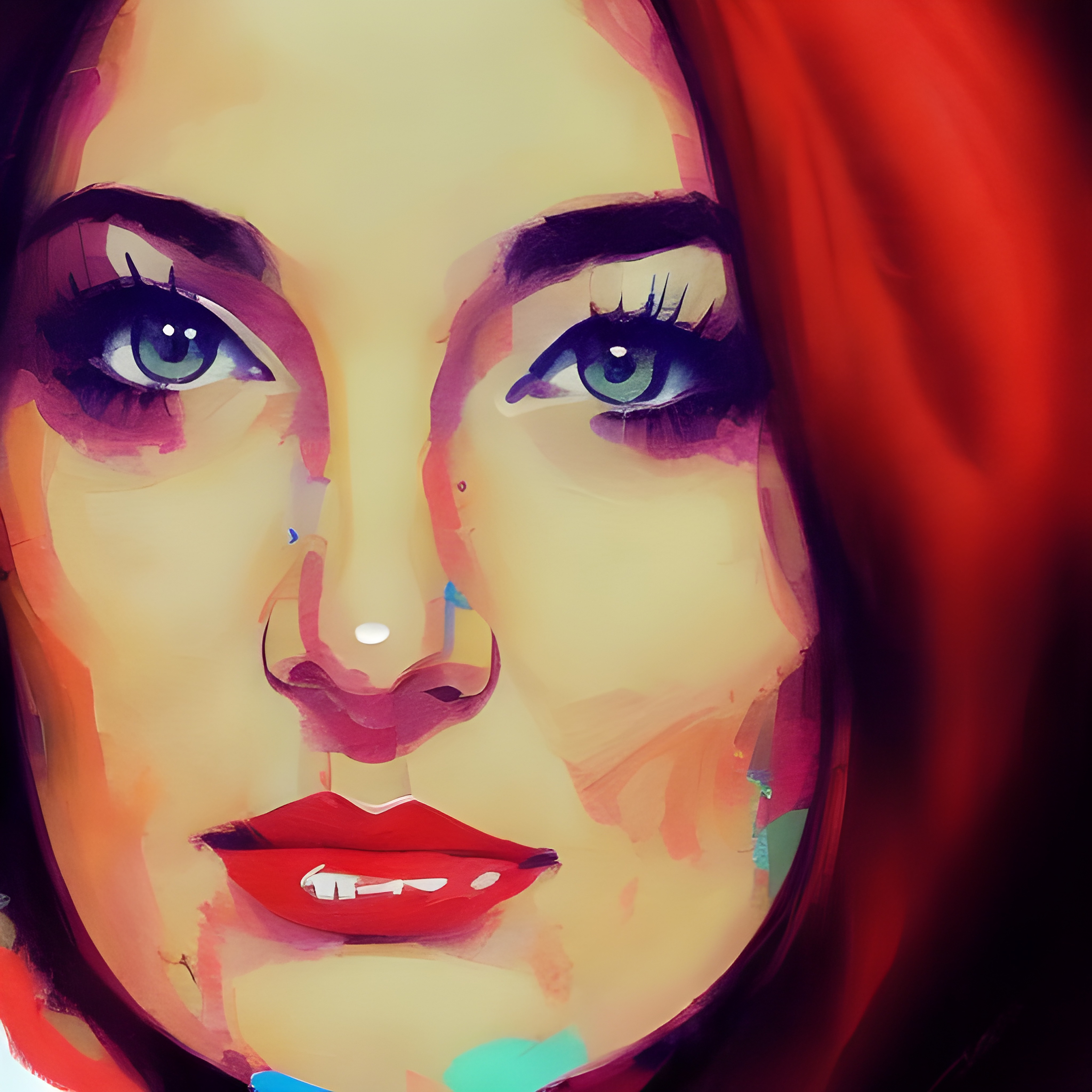 Close-up painting of a woman`s face with blue eyes and red lips.