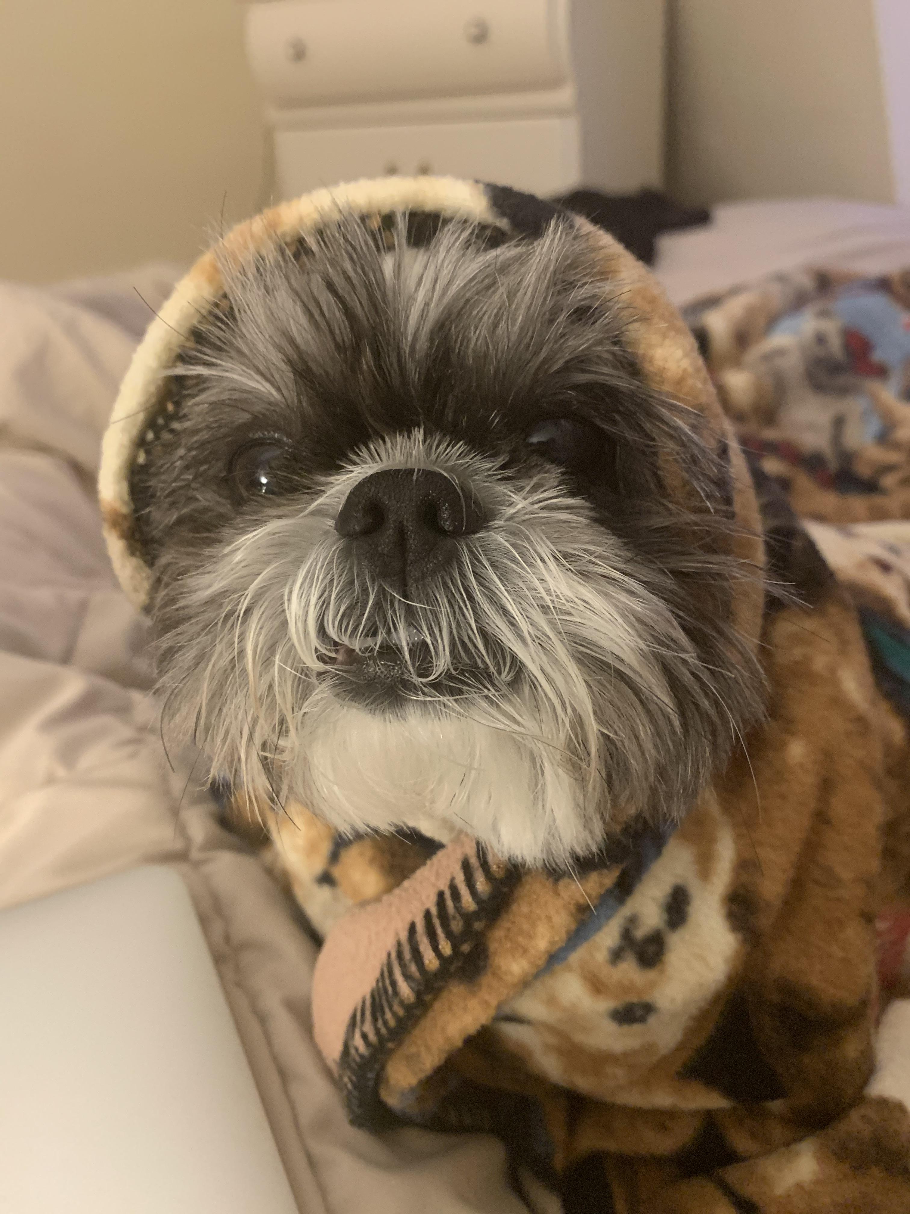 Painted portrait of a pit bull, Shih Tzu, and two cats.