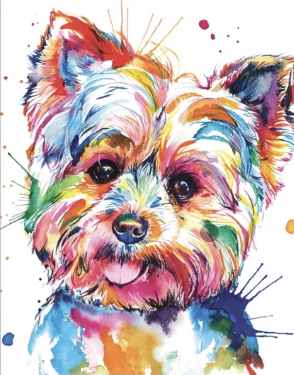 Painting of two happy dogs, one black and tan, the other brown and white, against a pastel background.