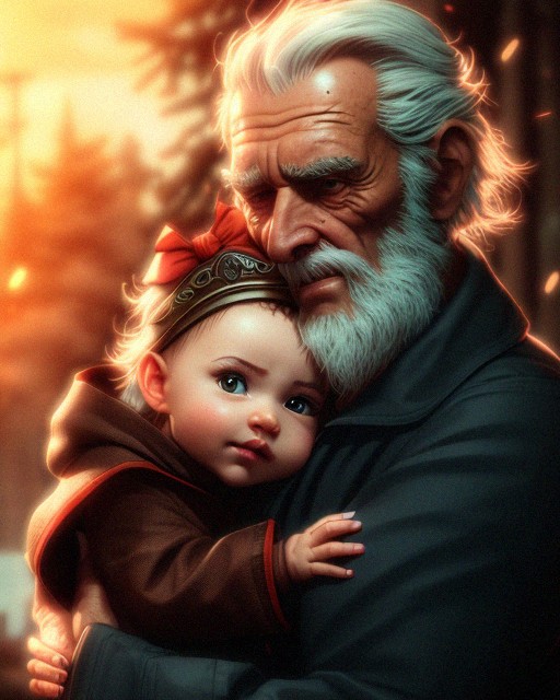 Oil painting of a smiling older man holding a baby girl wearing a lavender bow.