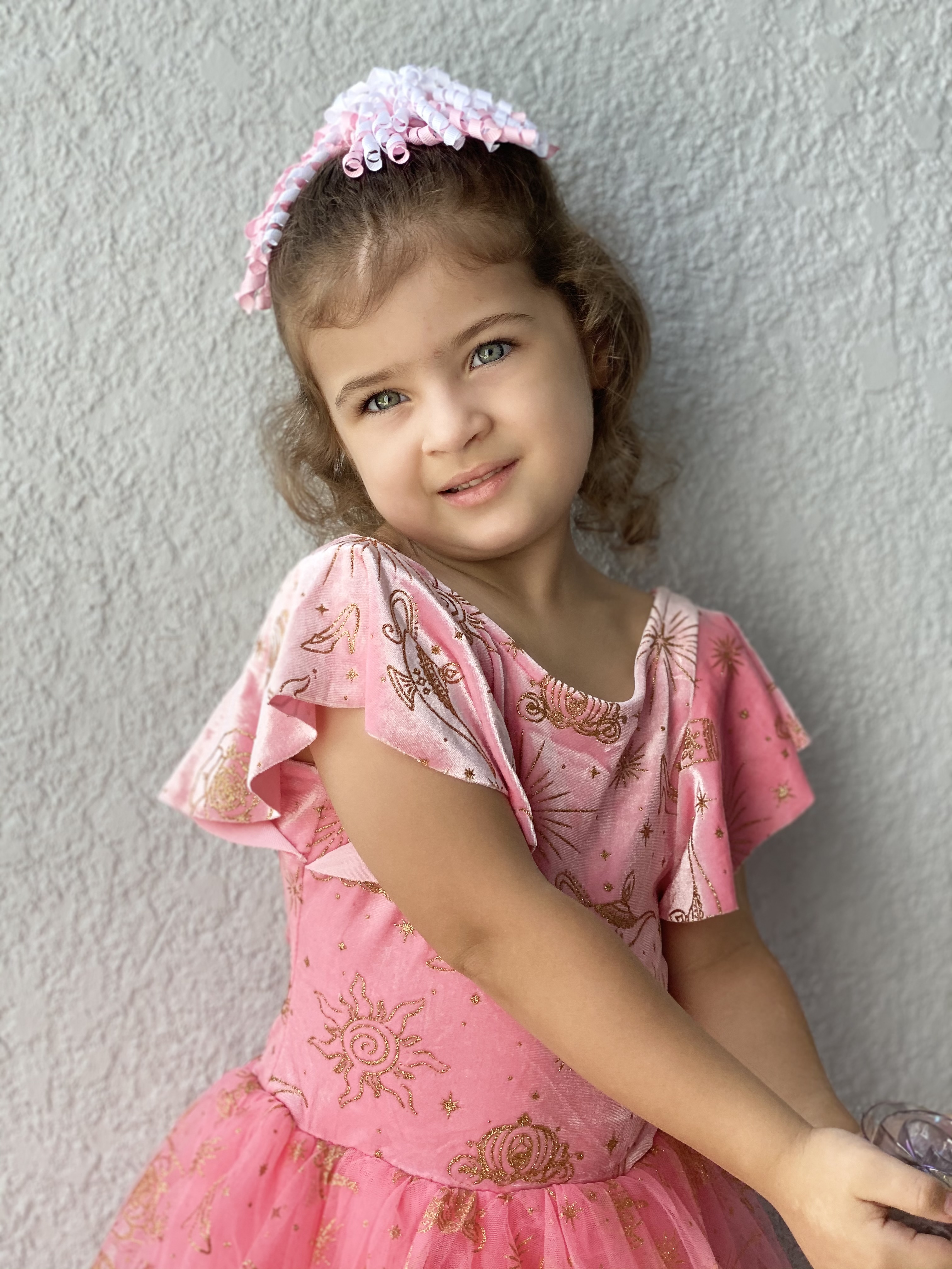 Oil painting portrait of a smiling girl in a pink dress and flower crown.
