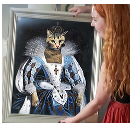 Painting of two dogs and two cats in ornate clothing resembling a royal portrait.