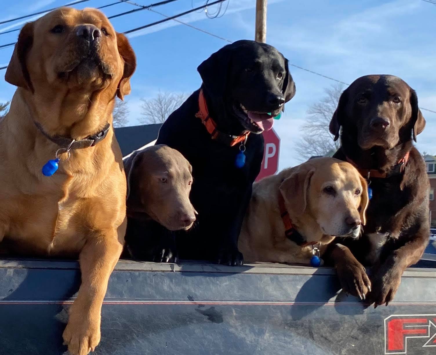 Painting of five dogs: Remy, Kimber, Benelli, Lucy, and Colt.