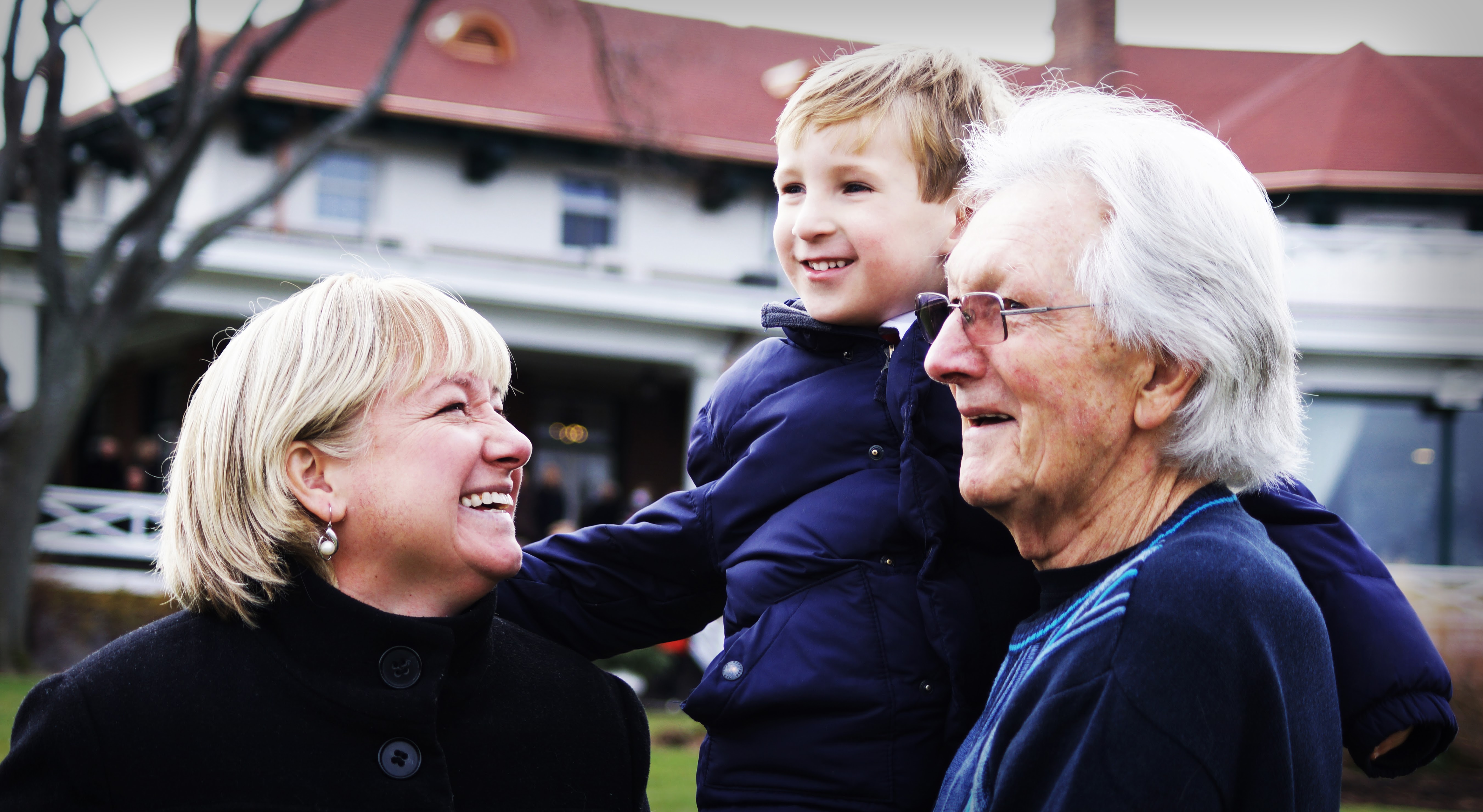 Oil painting of three generations of women: a young boy, his mother, and his grandmother.