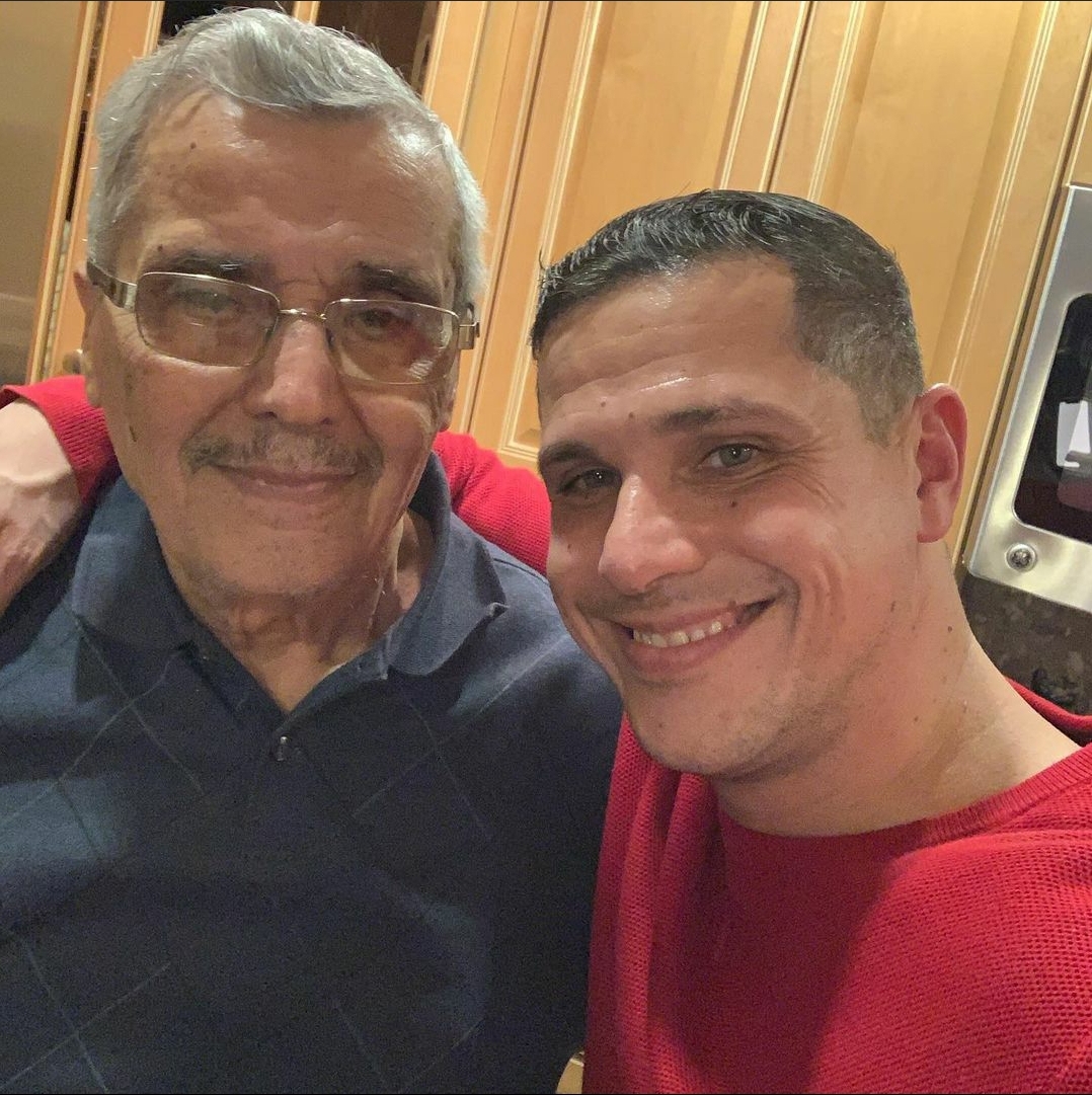 Painting of an older man and a younger man embracing, text reads Siempre te amare Hijo