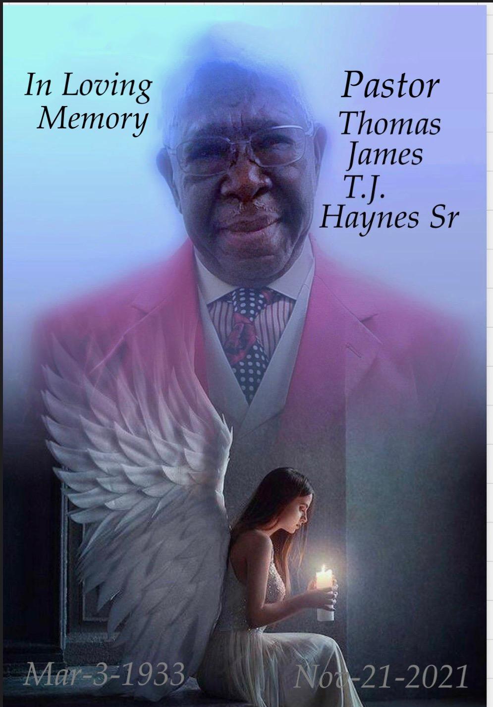 Memorial portrait of Pastor Thomas James T.J. Haynes Sr. 1933-2021, with a woman holding a candle.