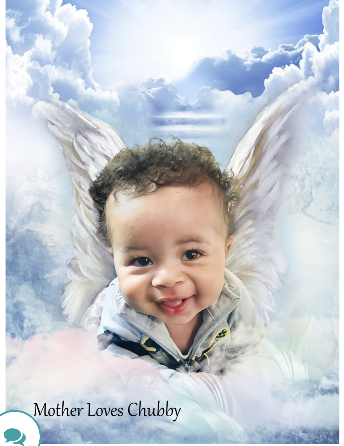 Painting of a smiling baby with angel wings against a cloudy sky.