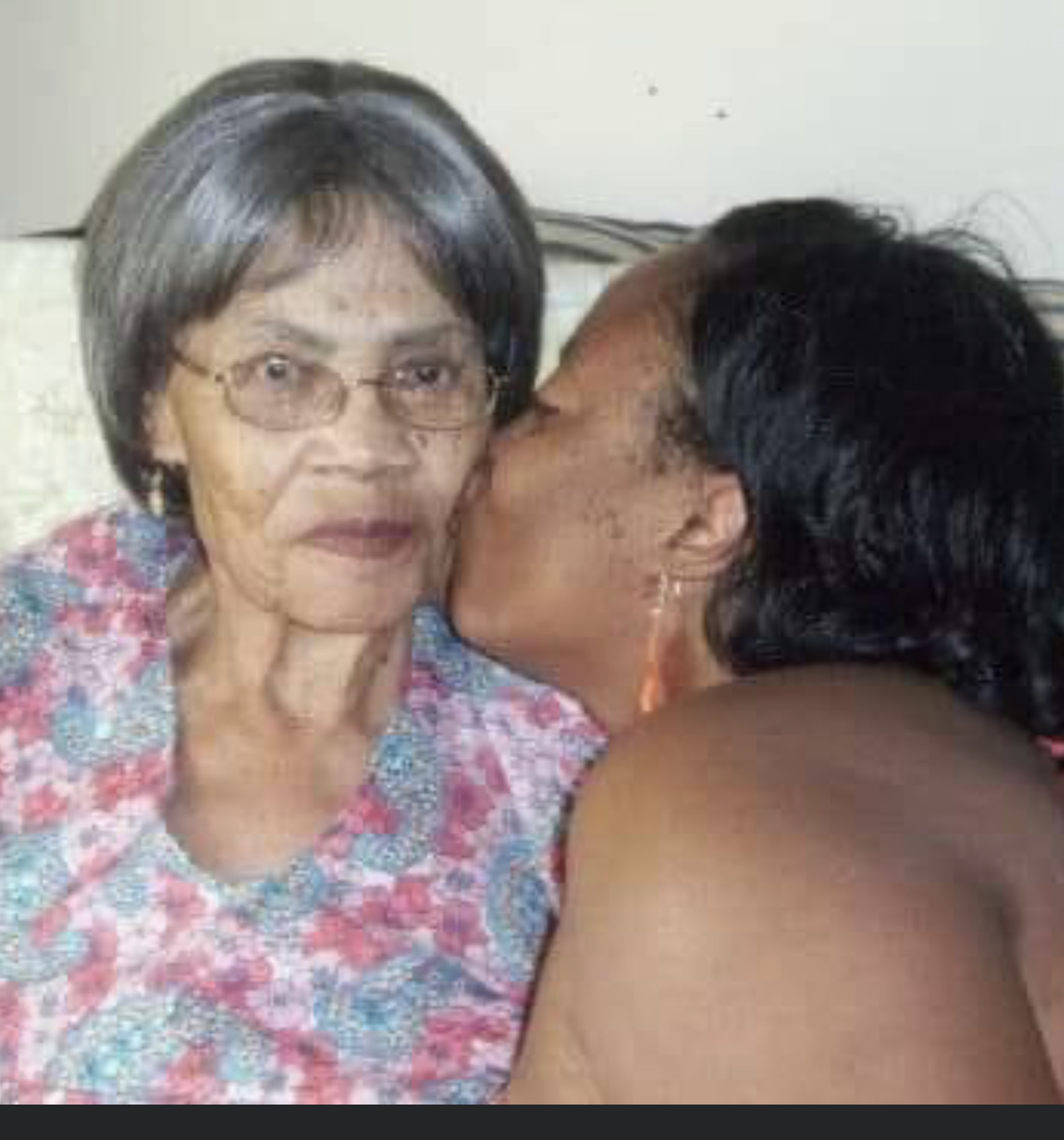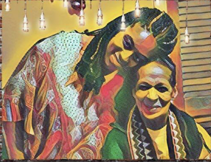 Painting of a woman kissing an older woman on the cheek
