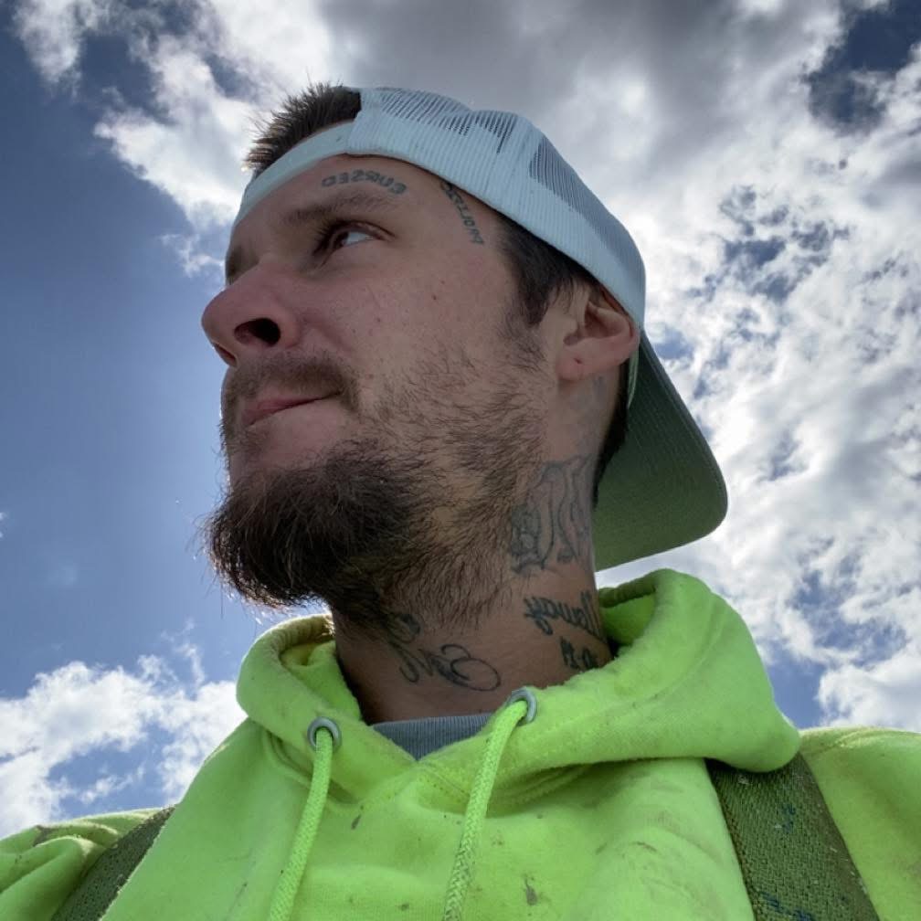 Black and white pencil portrait of a man with tattoos, wearing a baseball cap and hoodie, looking upward, text reads Forever in our hearts