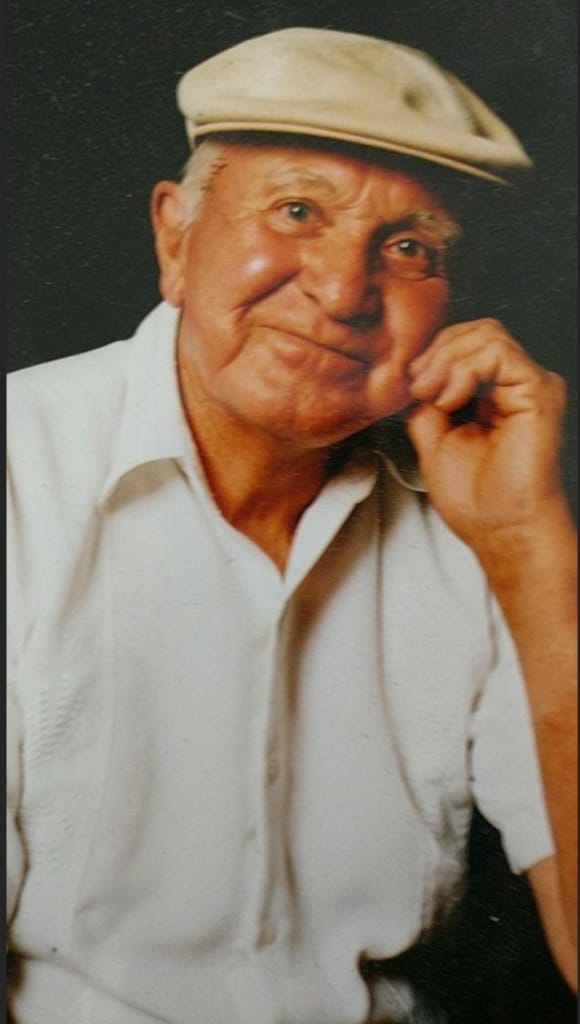 Black and white pencil portrait of an elderly man wearing a flat cap.