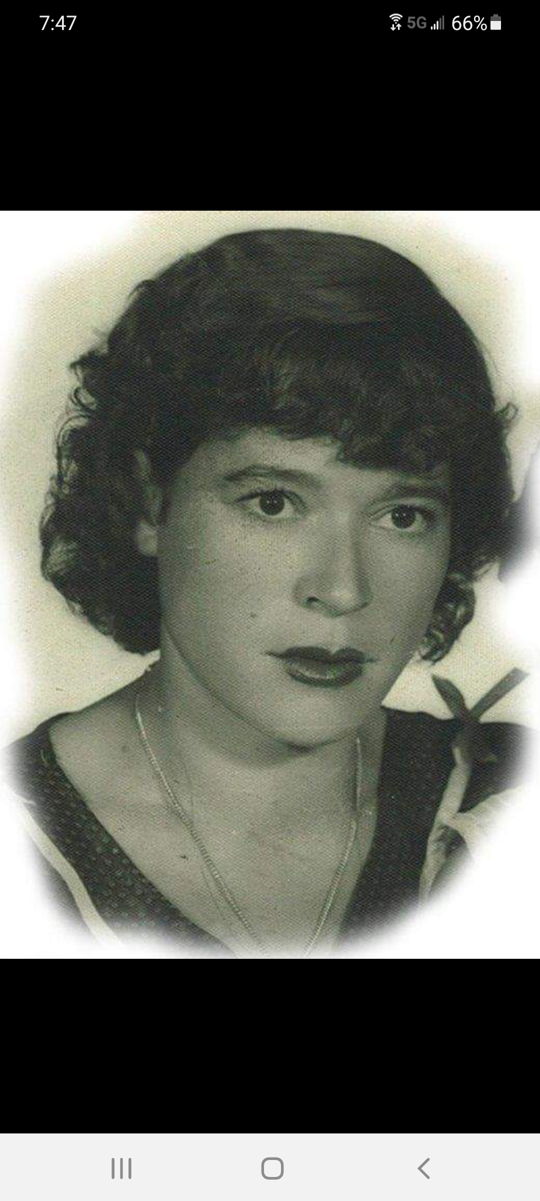 Black and white pencil portrait of a woman with short, curly hair.