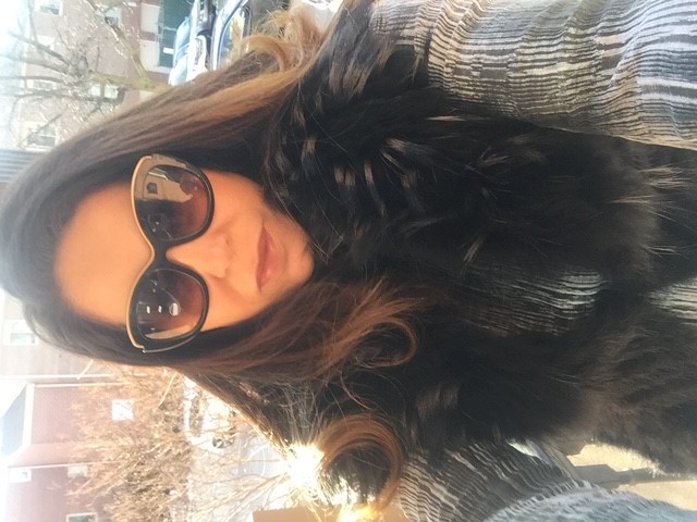 Black and white pencil portrait of a woman wearing sunglasses and a fur collar.