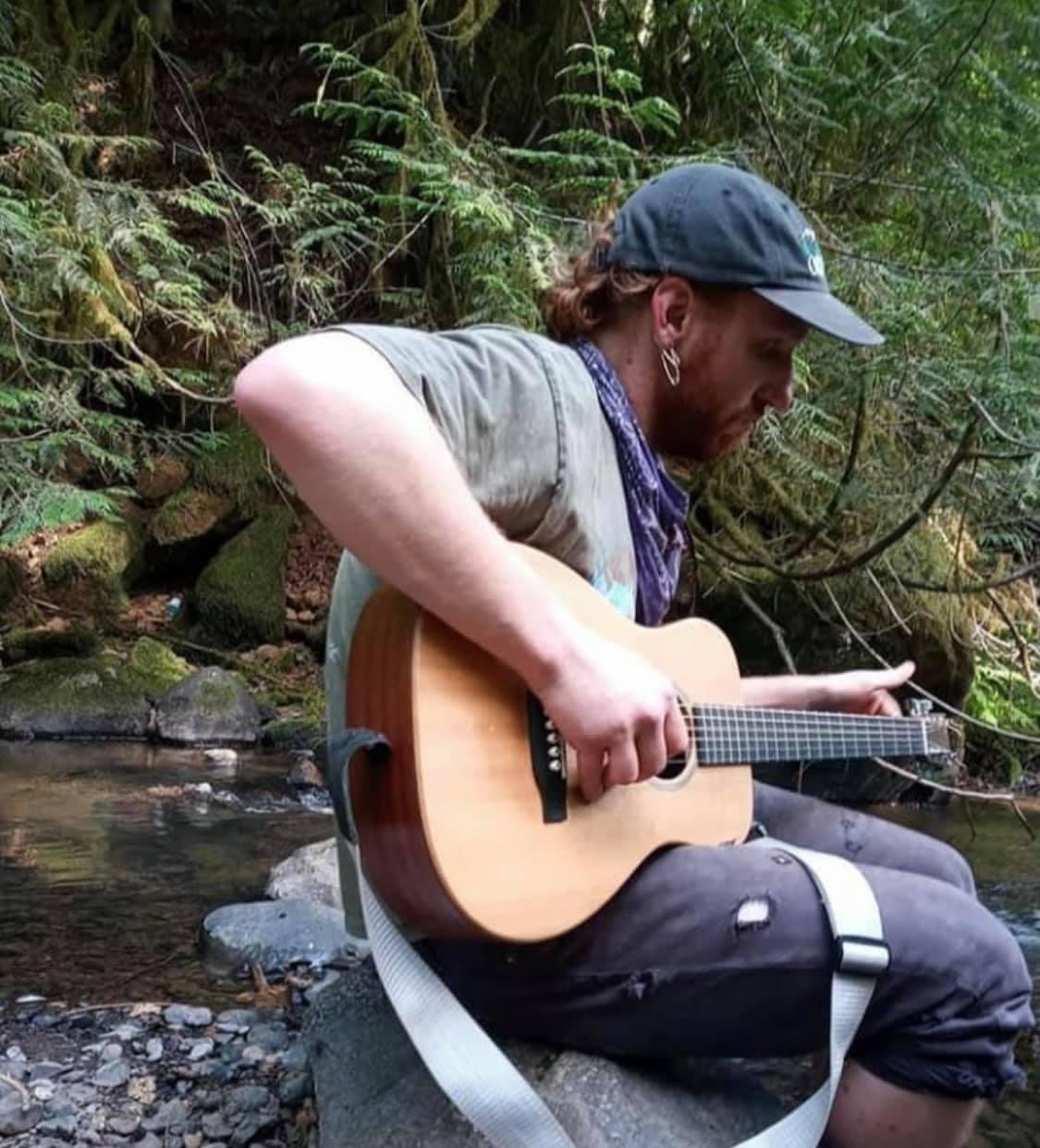 Black and white drawing of a man playing an acoustic guitar by a stream.