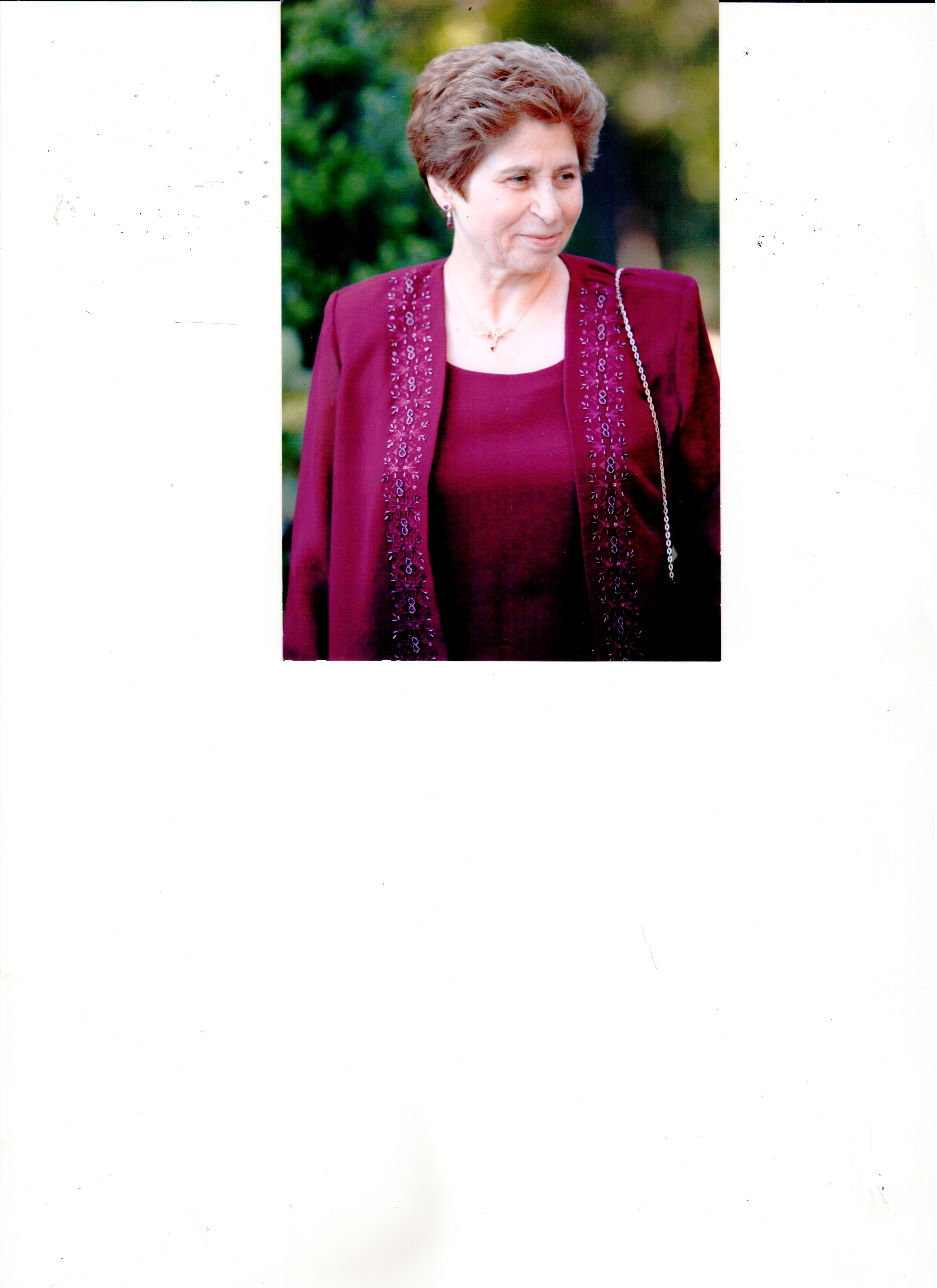 Black and white portrait of an elderly woman wearing a headscarf and patterned cardigan.