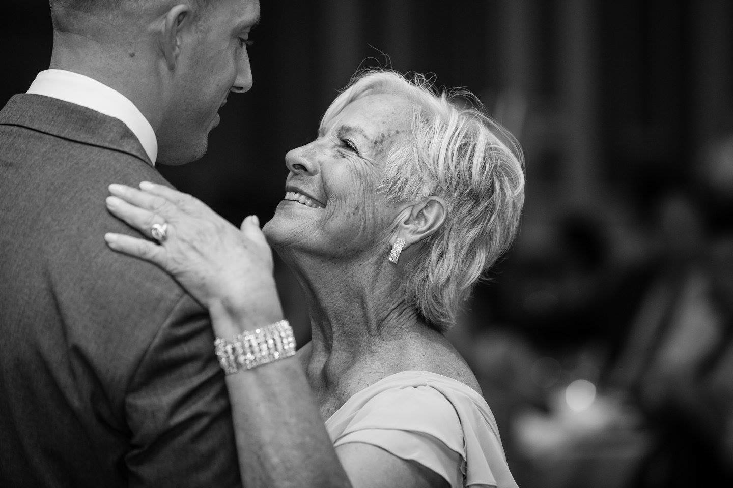 Black and white pencil portrait of a smiling woman wearing a dark jacket with ornate detailing.