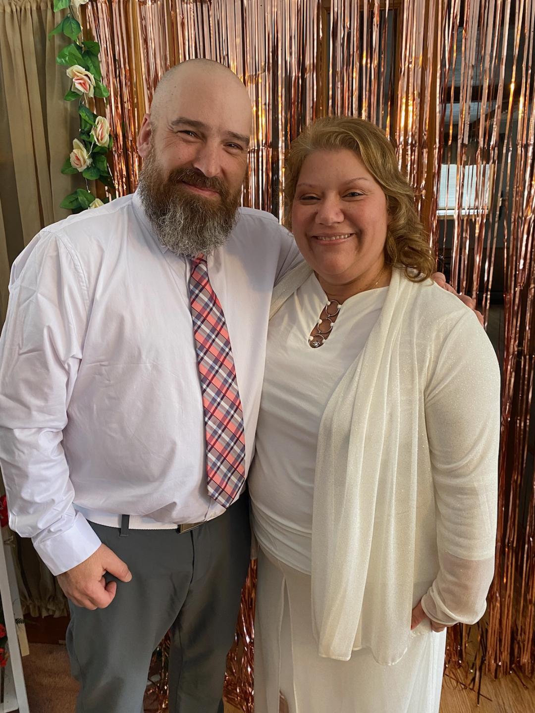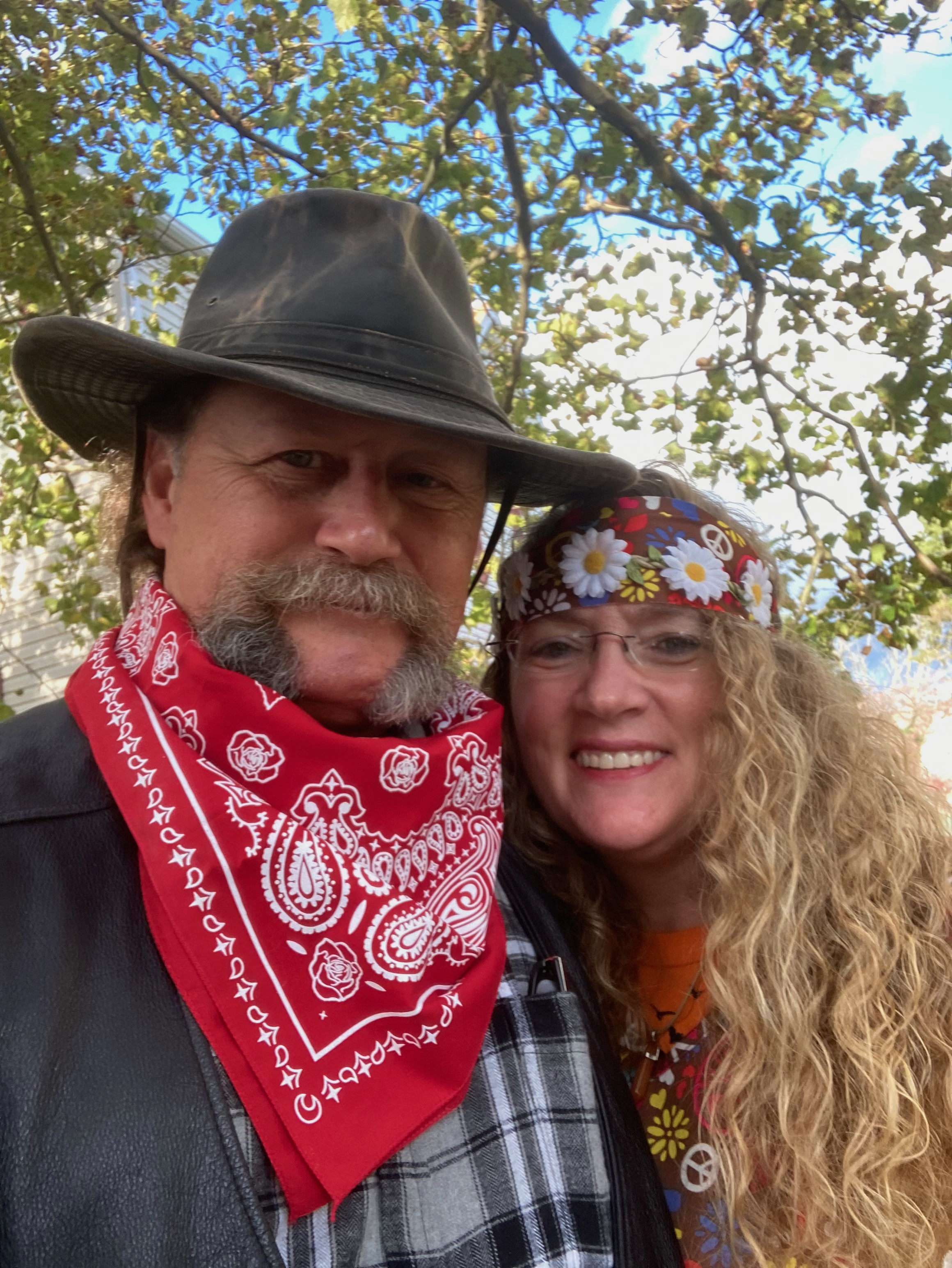 Black and white charcoal portrait of a couple, the man wears a cowboy hat and bandana, the woman wears a headband with flowers.