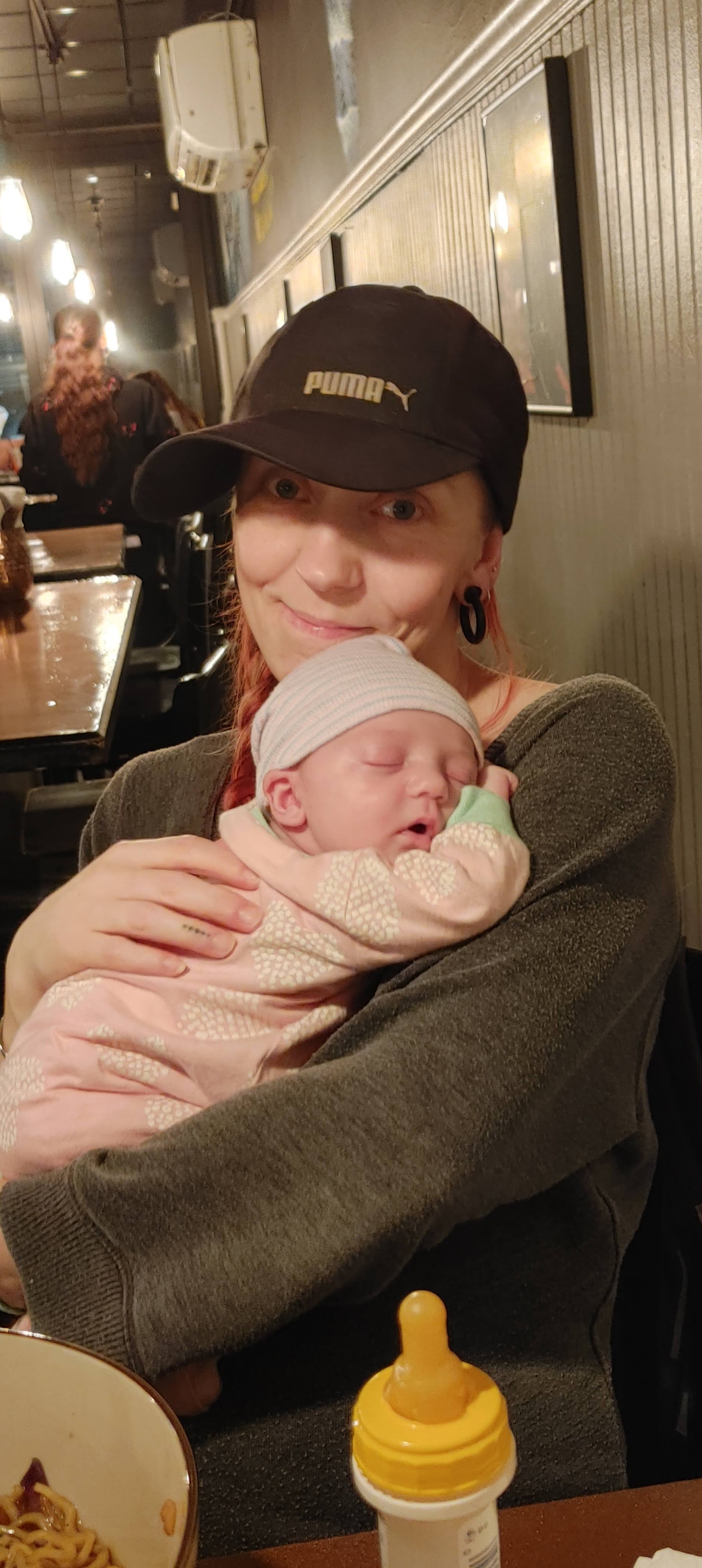 Black and white pencil drawing of a mother holding her sleeping newborn baby.