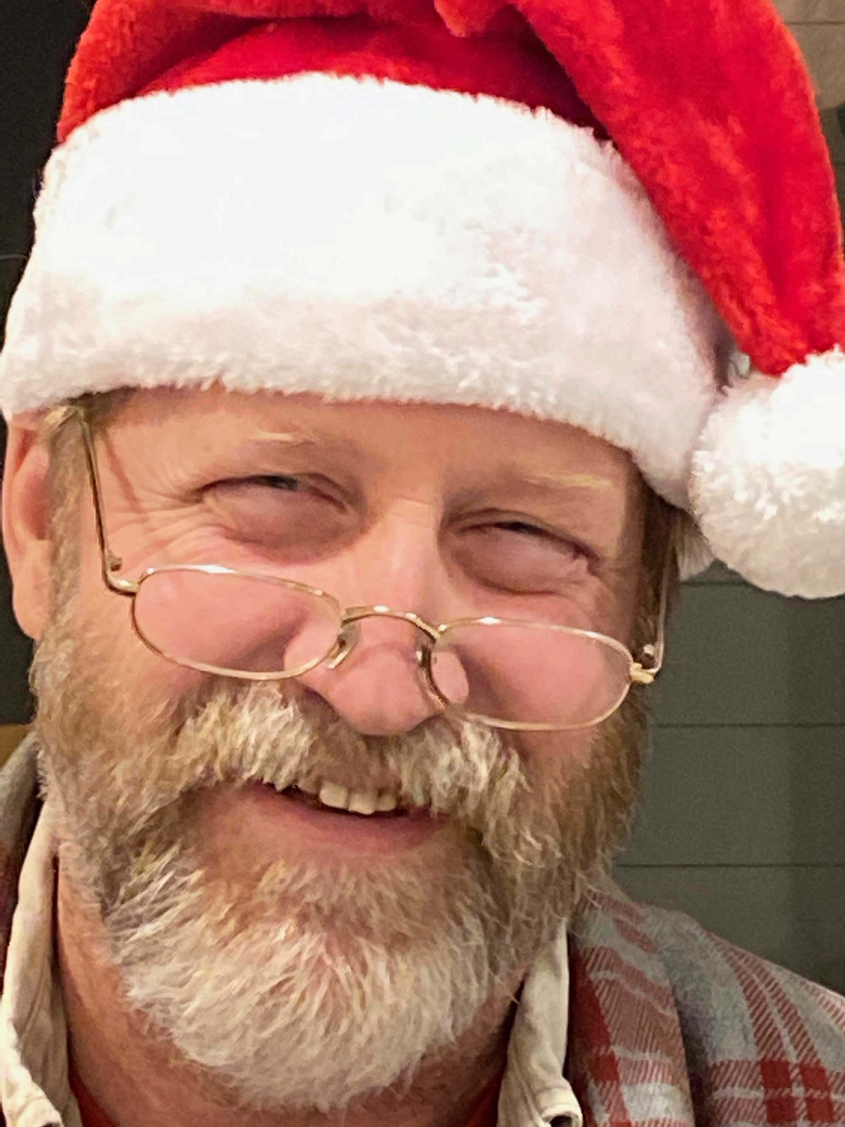 Black and white pencil sketch of a smiling man wearing glasses and a Santa hat.