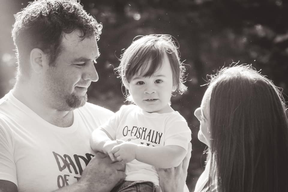 Black and white pencil sketch of a mother, daughter, toddler, and baby.