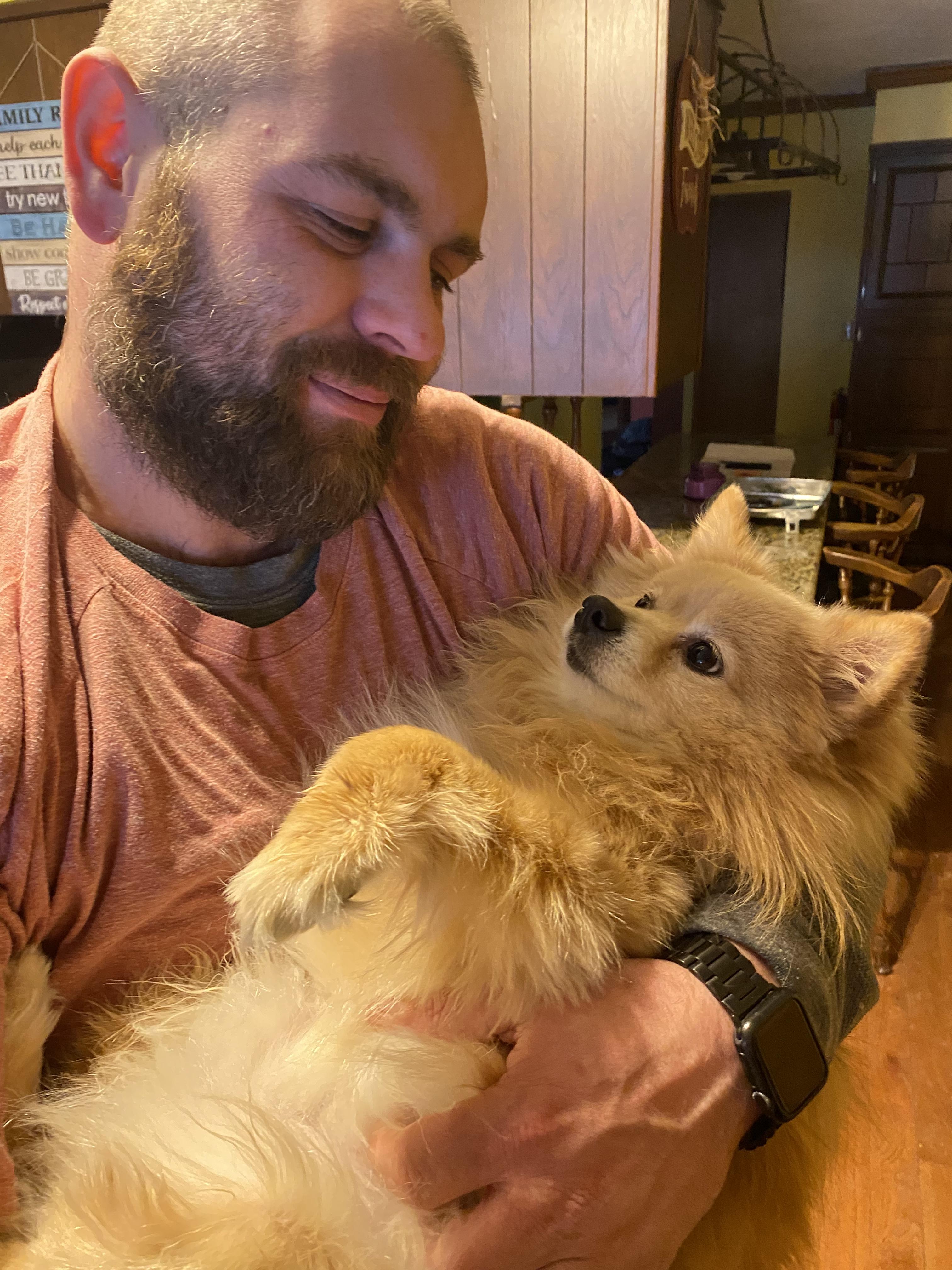 Black and white pencil drawing of a man in an Egyptian headdress with a small dog wearing an ornate collar, pyramids in the background.