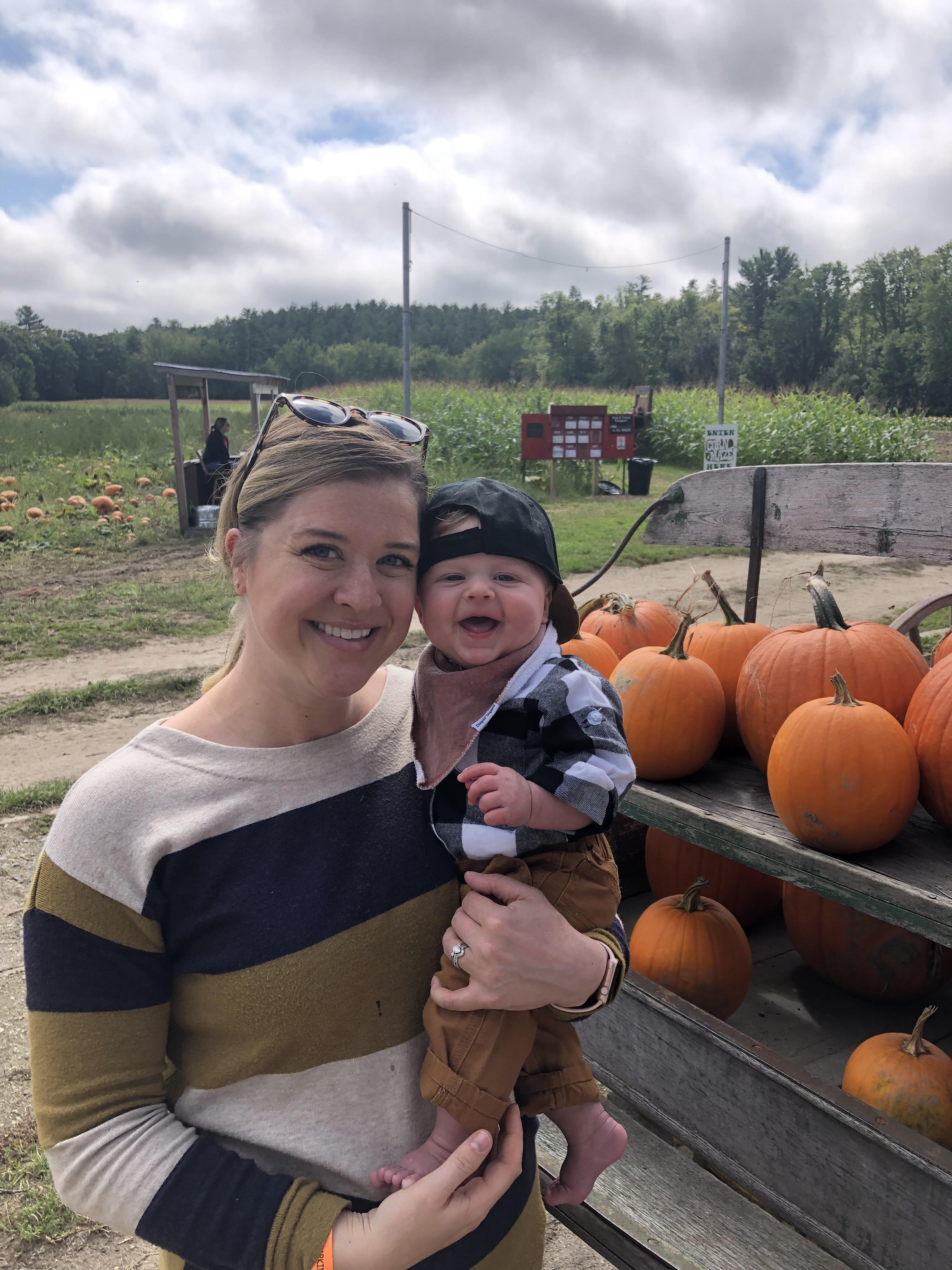 Black and white pencil drawing of a mother and baby at a pumpkin patch.