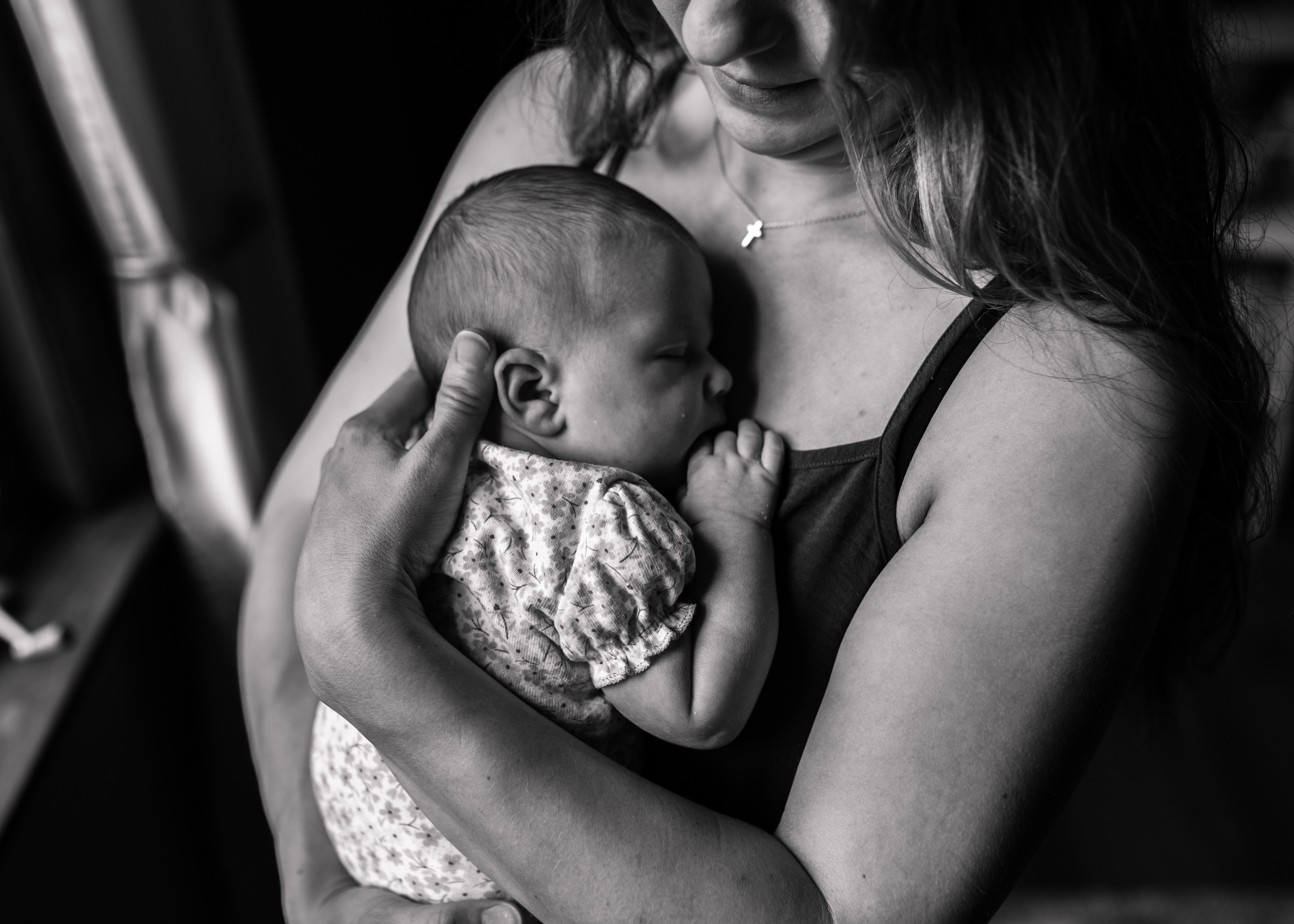 Black and white charcoal drawing of a mother holding her sleeping baby.