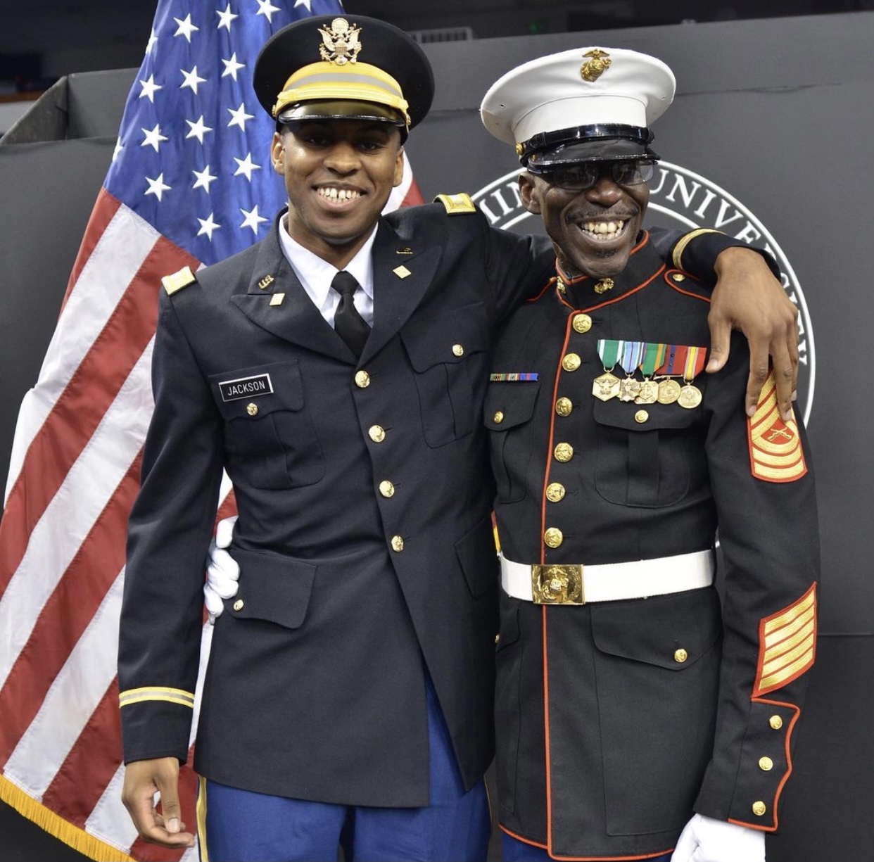 Black and white pencil sketch of two smiling men in military dress uniforms, one in Army and one in Marine Corps uniform, arm in arm in front of an American flag.