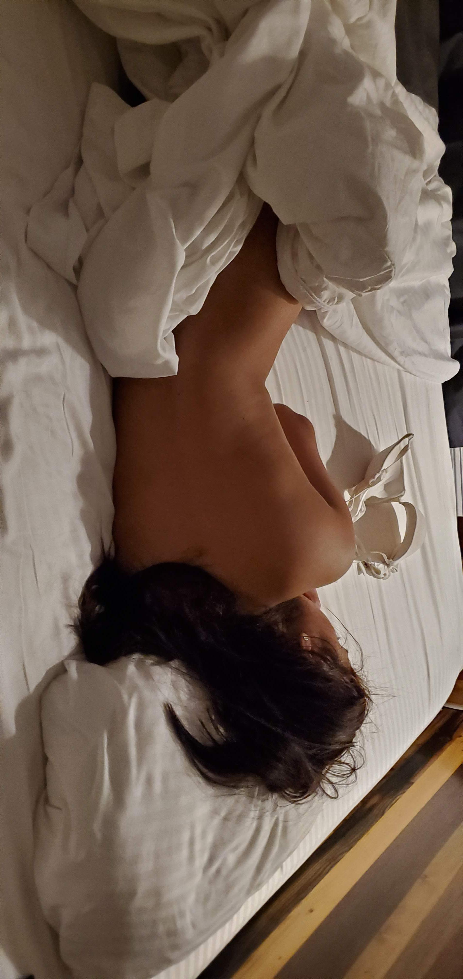 Black and white drawing of a nude woman lying in bed.