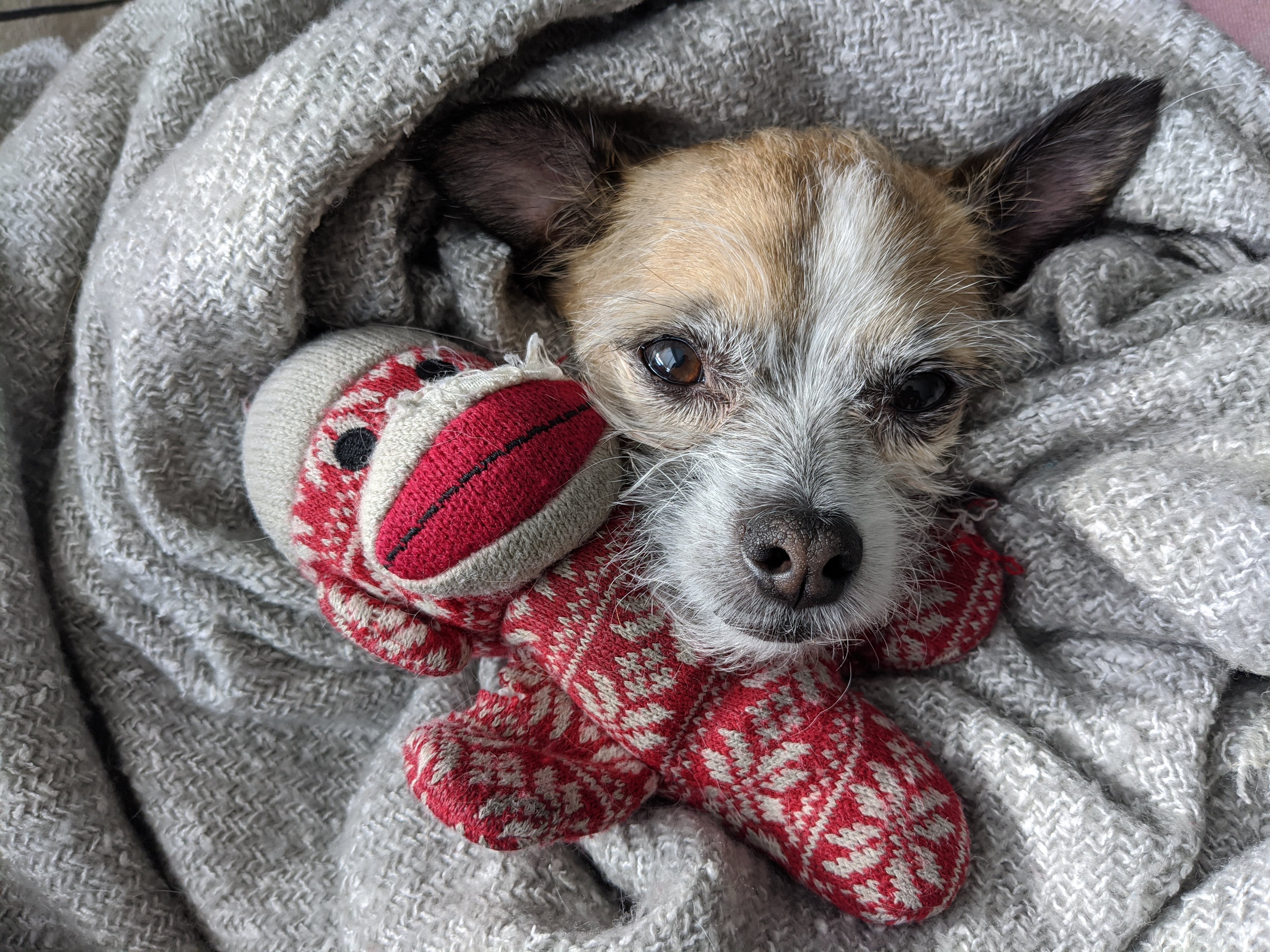 Charcoal drawing of a small dog nestled in a blanket with a toy.