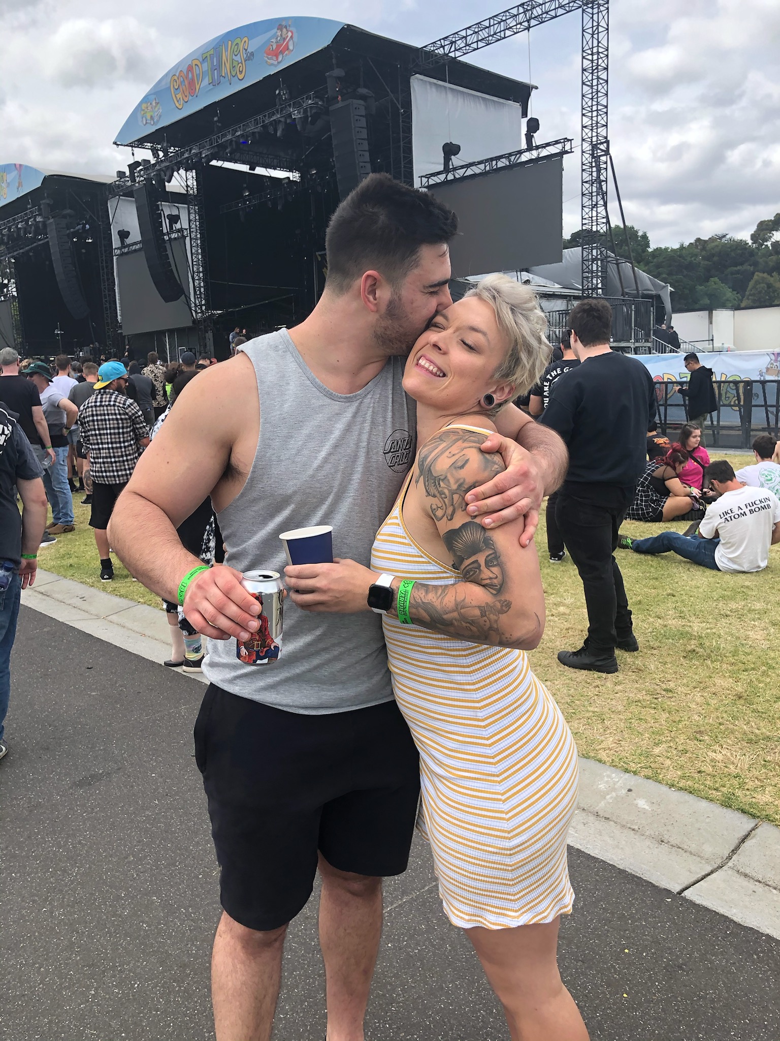 Pencil drawing of a man kissing a smiling woman on the cheek, she has tattoos on her arm and they are holding drinks.