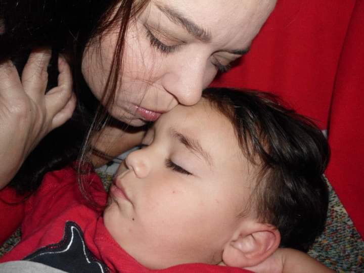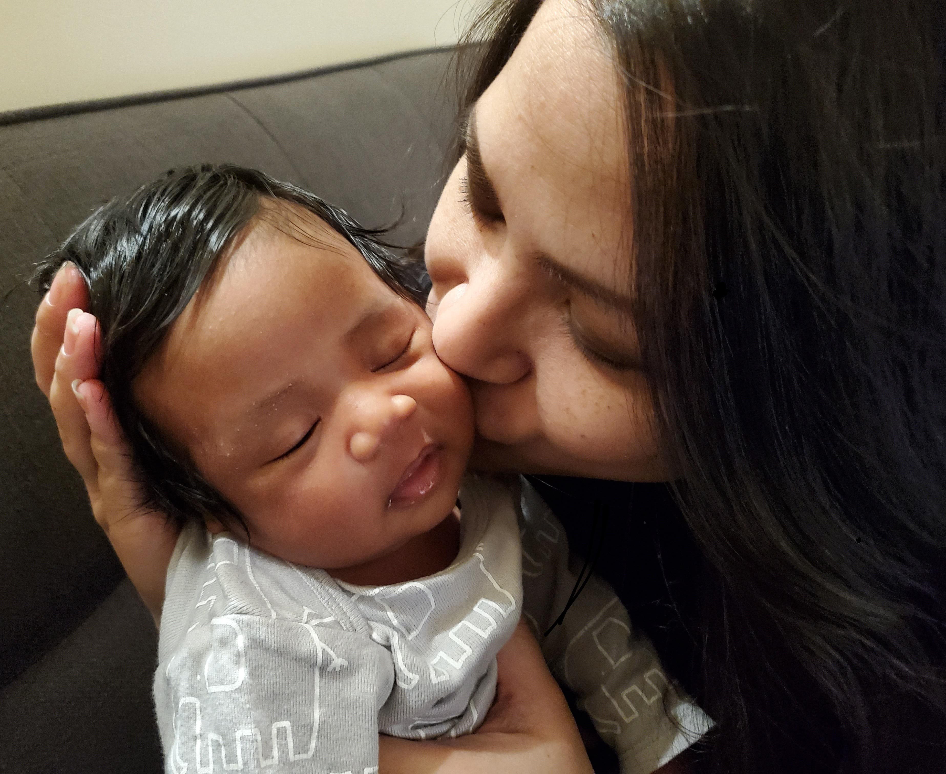 Black and white charcoal drawing of a mother kissing her sleeping baby.