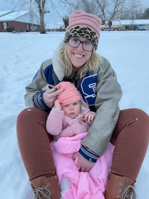 Pencil sketch of a smiling woman in a winter hat and glasses holding a toddler in a snowy landscape.