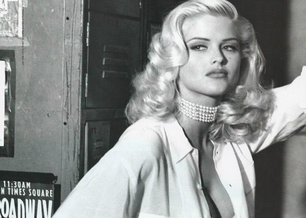 Black and white pencil drawing of a blonde woman wearing a pearl choker and an unbuttoned shirt, near a metal locker.