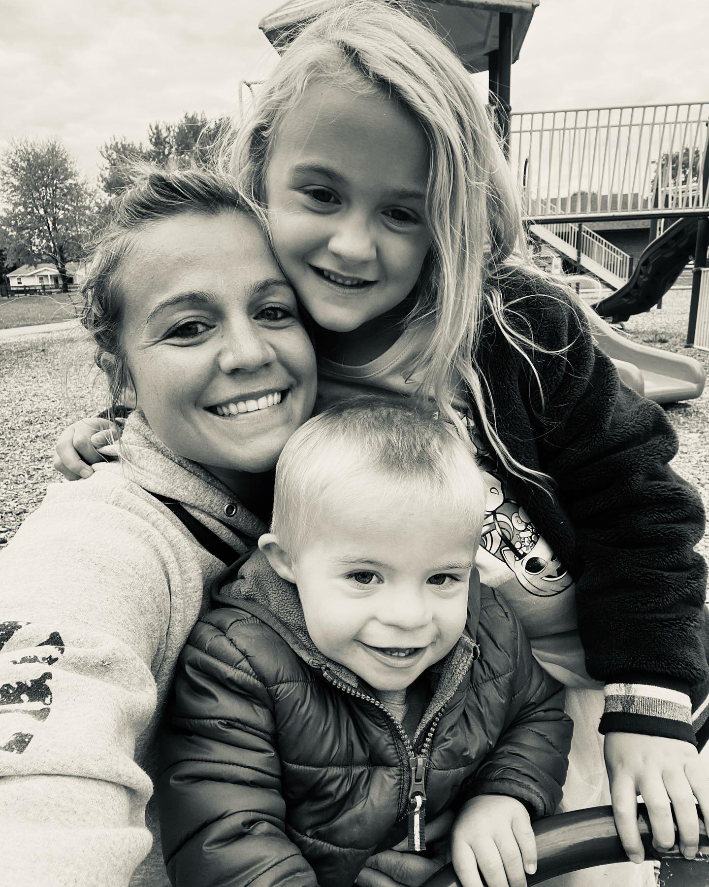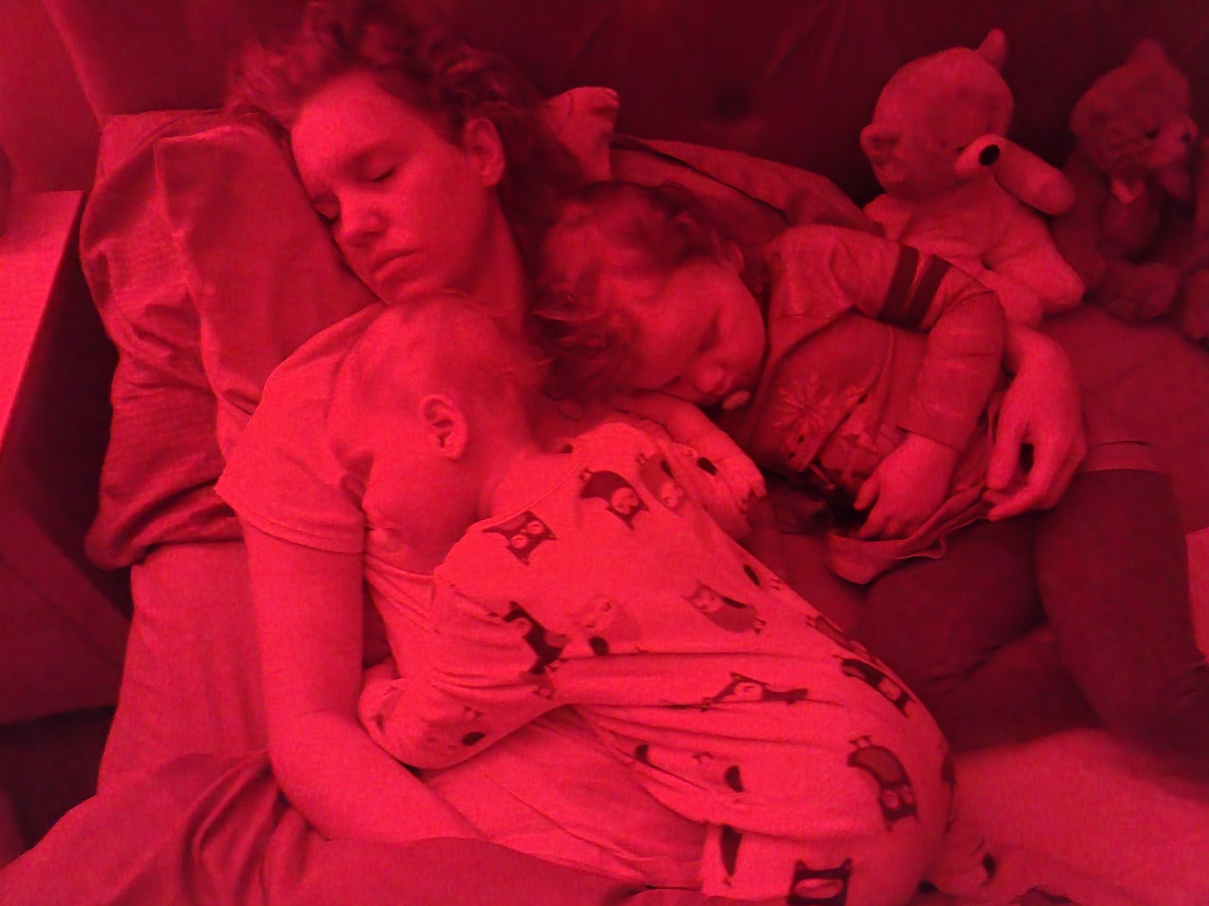Charcoal drawing of a mother sleeping with her two young children.
