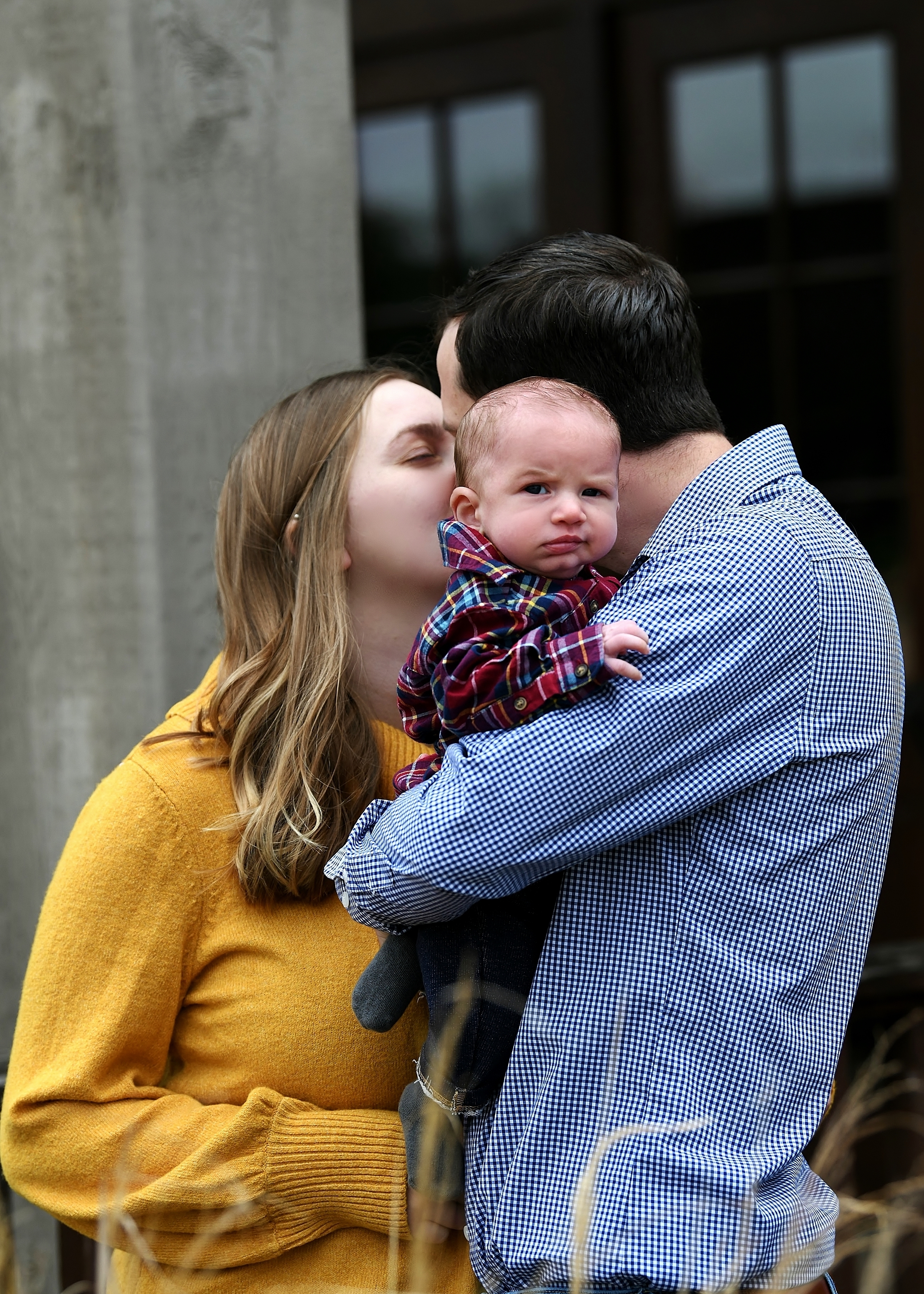 Black and white pencil sketch of a family portrait, a couple kissing with their baby in between them.