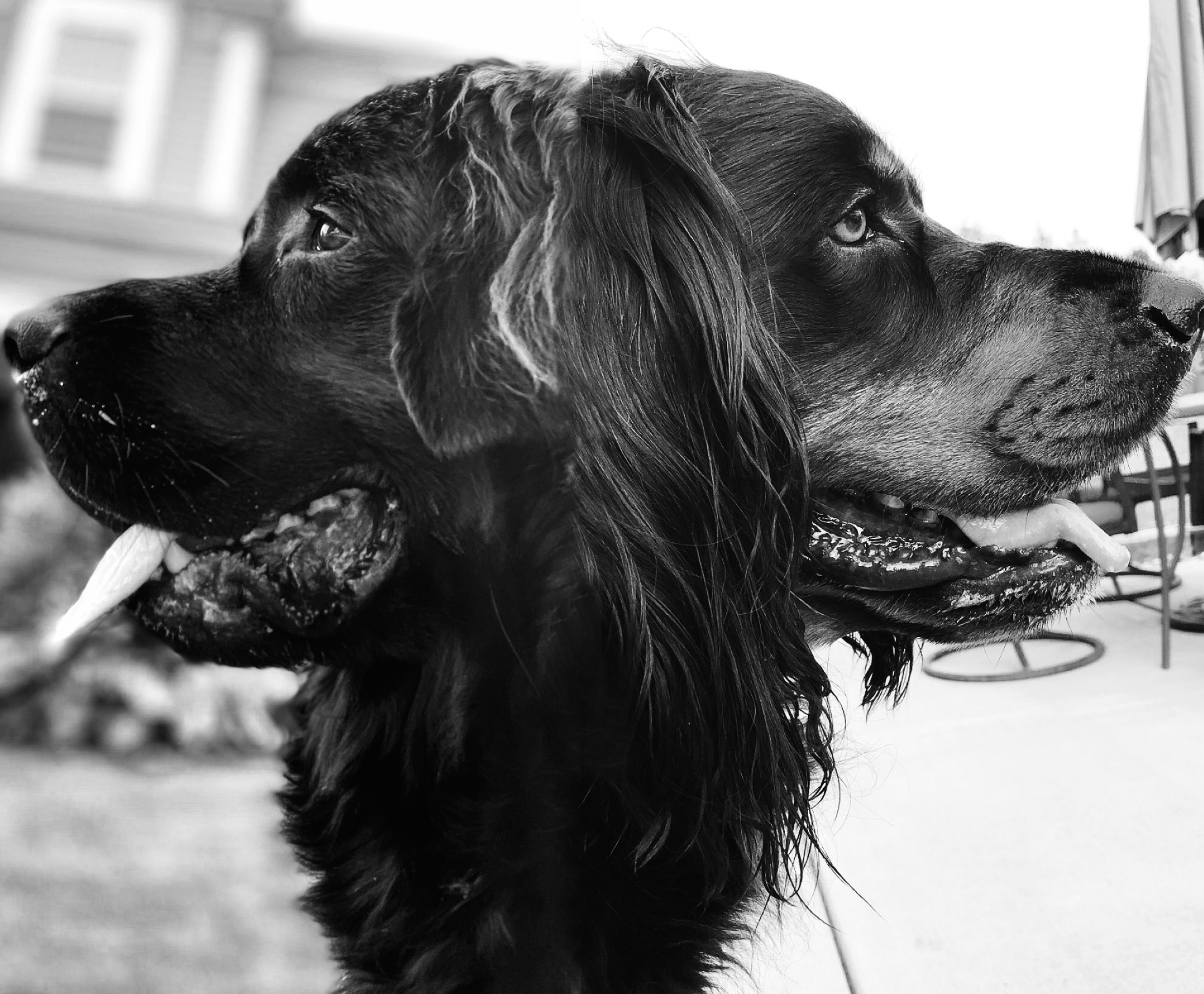 Black and white pencil drawing of two dogs` heads, side by side.