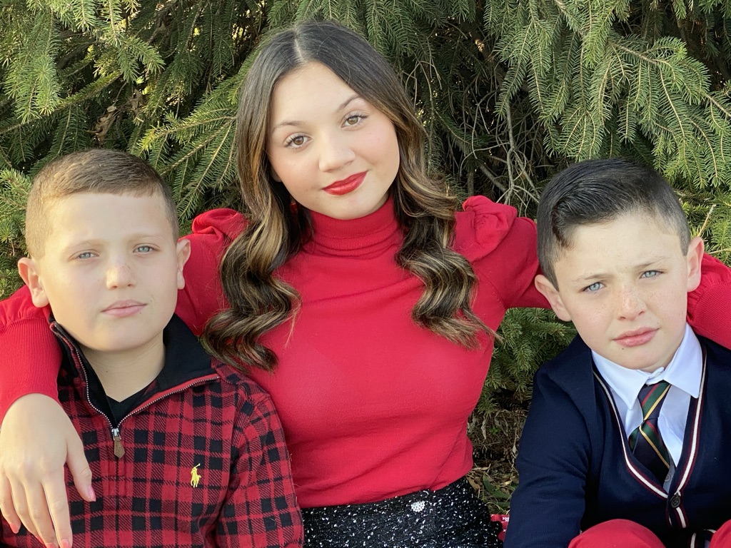 Black and white charcoal drawing of a woman and two boys.