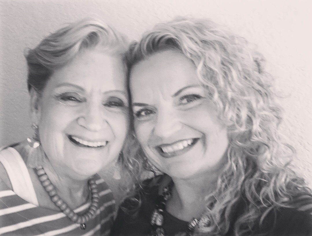 Black and white portrait drawing of two smiling women, shoulders touching.