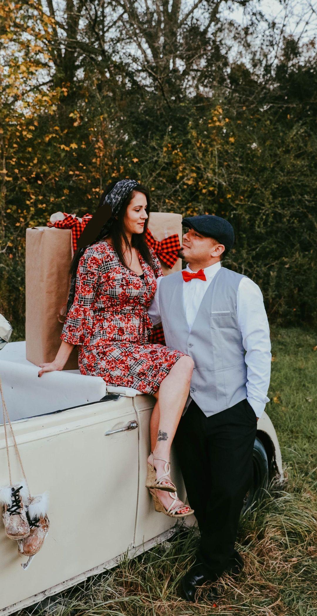 Black and white pencil drawing of a couple, woman in patterned dress sits on a car, man in vest and cap stands beside her.