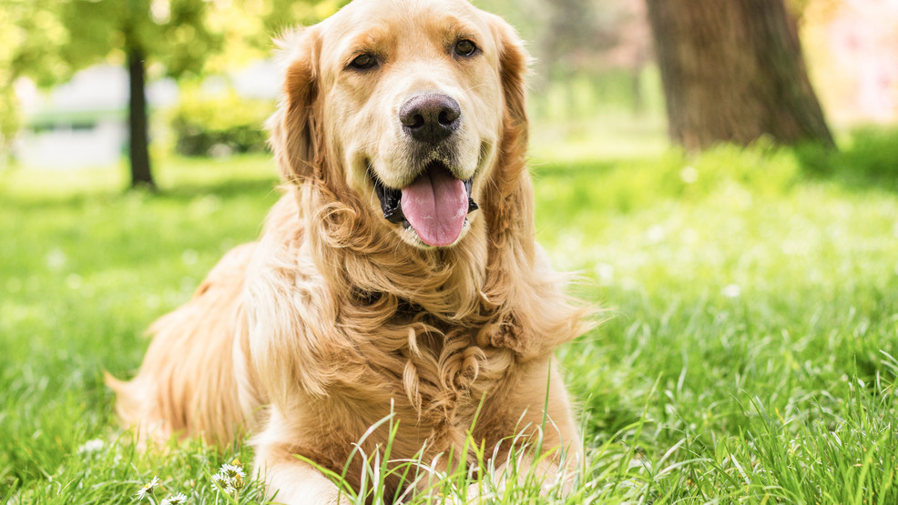 Pencil drawing of a Golden Retriever sitting in the grass with its tongue out.