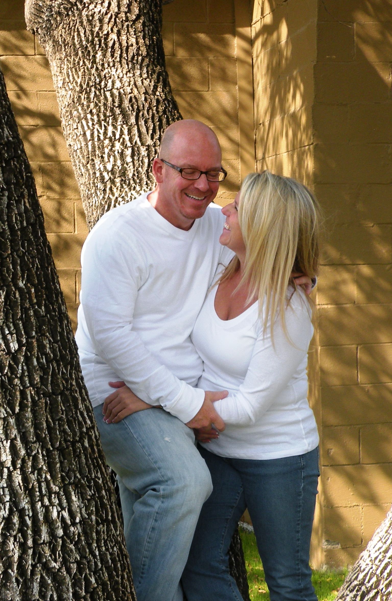 Black and white pencil sketch of a smiling couple embracing near a tree.