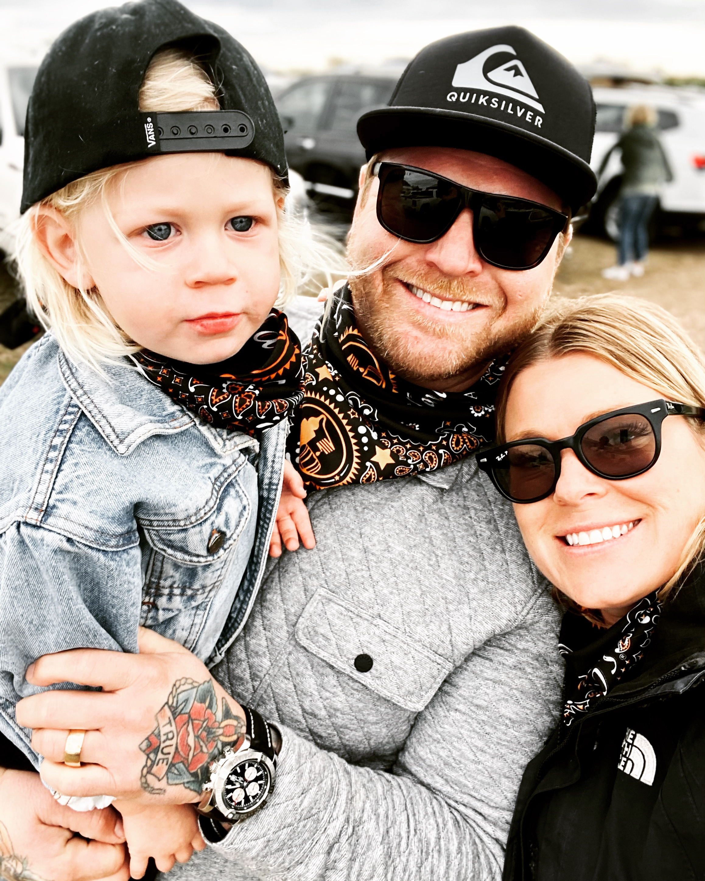Black and white pencil drawing of a family portrait: a man, woman, and young child.