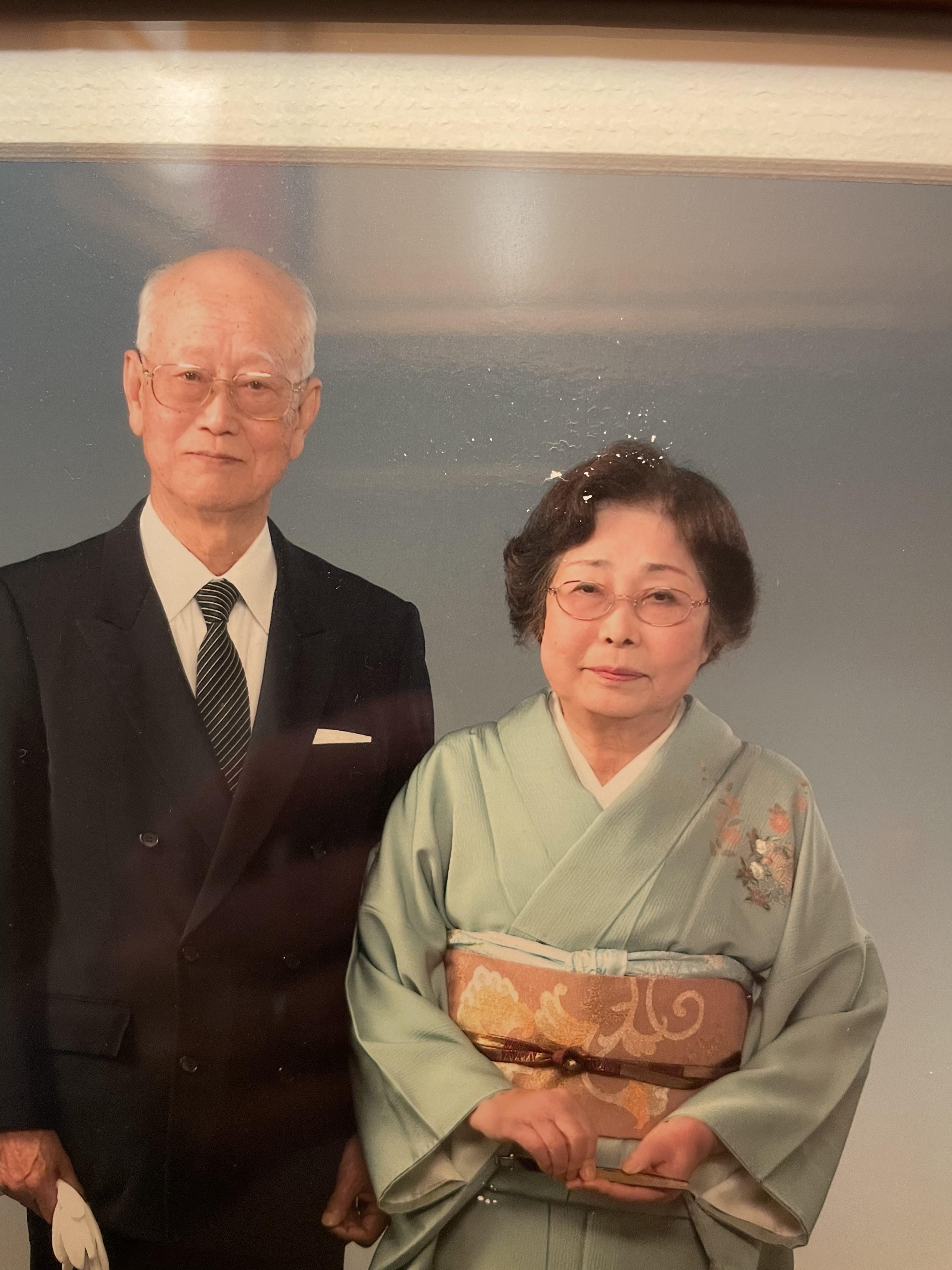 Black and white portrait of a smiling older couple in front of their house.