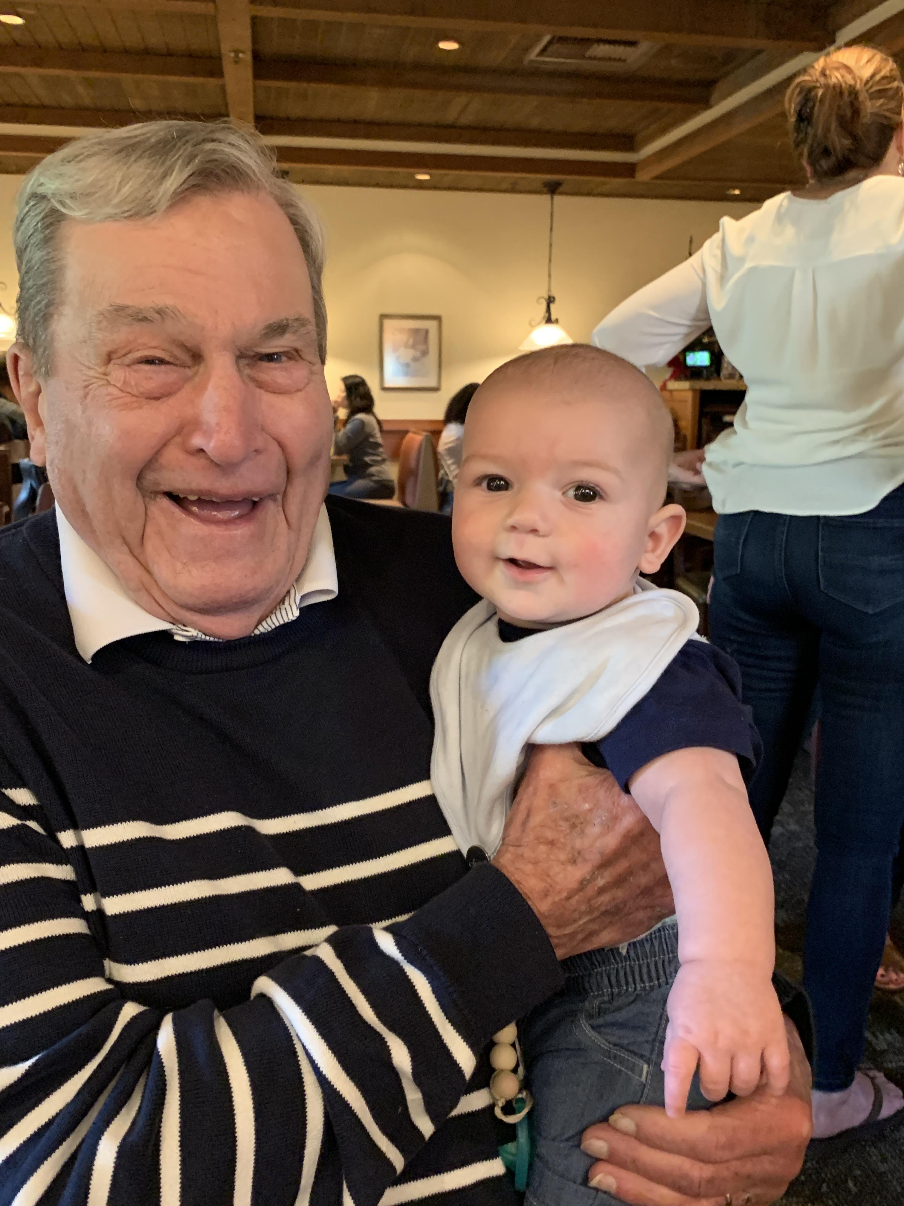 Black and white pencil drawing of a smiling older man holding a laughing baby.
