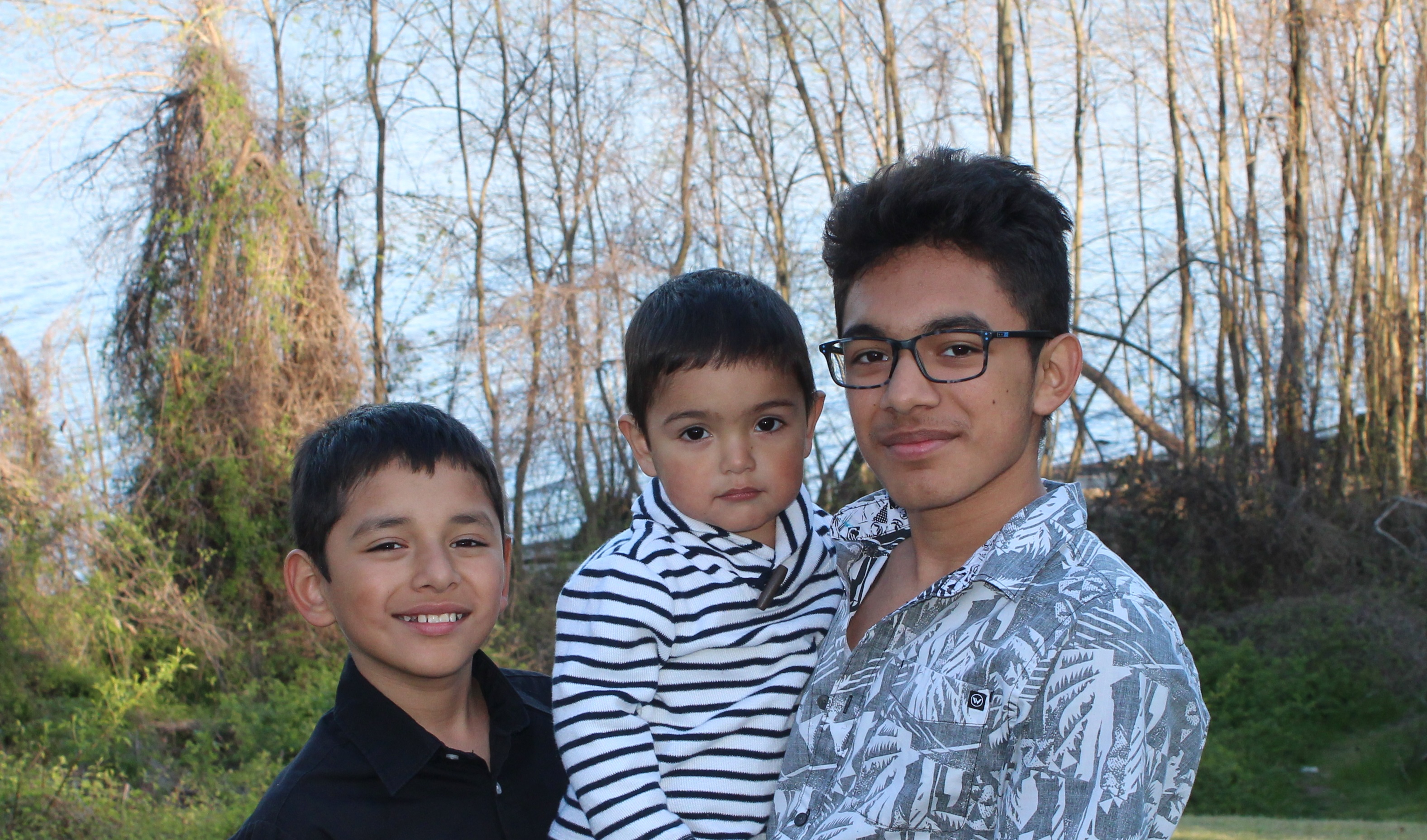 Pencil sketch of three boys in front of a wooded background.