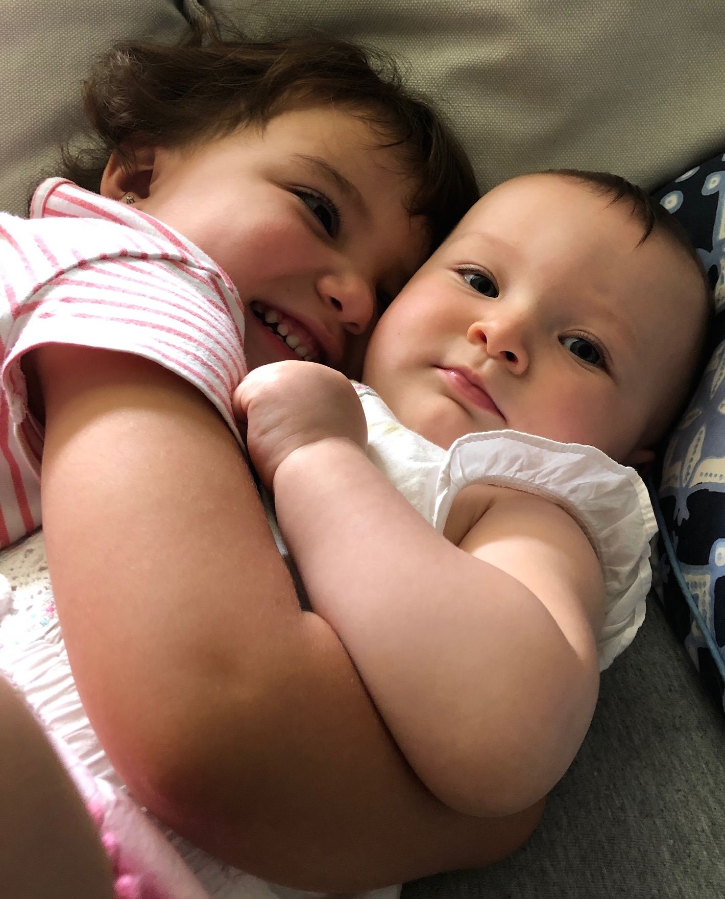 Black and white pencil drawing of a toddler hugging a baby.